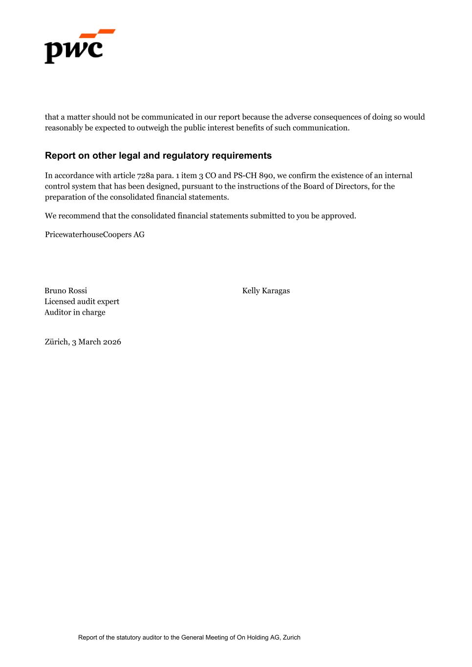 that a matter should not be communicated in our report because the adverse consequences of doing so would reasonably be expected to outweigh the public interest benefits of such communication. Report on other legal and regulatory requirements In accordance with article 728a para. 1 item 3 CO and PS-CH 890, we confirm the existence of an internal control system that has been designed, pursuant to the instructions of the Board of Directors, for the preparation of the consolidated financial statements. We recommend that the consolidated financial statements submitted to you be approved. PricewaterhouseCoopers AG Bruno Rossi Kelly Karagas Licensed audit expert Auditor in charge Zürich, 3 March 2026 Report of the statutory auditor to the General Meeting of On Holding AG, Zurich