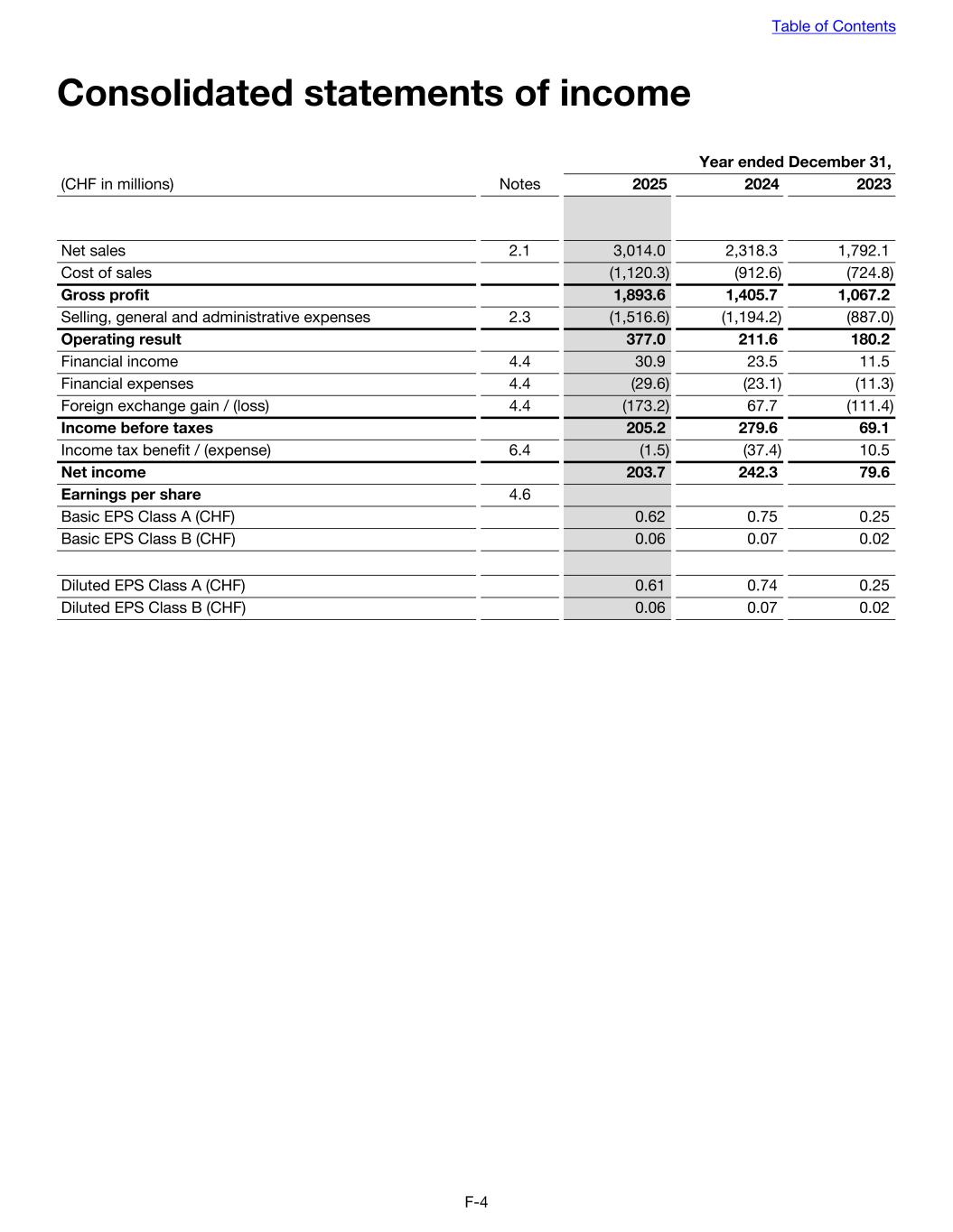 Consolidated statements of income Year ended December 31, (CHF in millions) Notes 2025 2024 2023 Net sales 2.1 3,014.0 2,318.3 1,792.1 Cost of sales (1,120.3) (912.6) (724.8) Gross profit 1,893.6 1,405.7 1,067.2 Selling, general and administrative expenses 2.3 (1,516.6) (1,194.2) (887.0) Operating result 377.0 211.6 180.2 Financial income 4.4 30.9 23.5 11.5 Financial expenses 4.4 (29.6) (23.1) (11.3) Foreign exchange gain / (loss) 4.4 (173.2) 67.7 (111.4) Income before taxes 205.2 279.6 69.1 Income tax benefit / (expense) 6.4 (1.5) (37.4) 10.5 Net income 203.7 242.3 79.6 Earnings per share 4.6 Basic EPS Class A (CHF) 0.62 0.75 0.25 Basic EPS Class B (CHF) 0.06 0.07 0.02 Diluted EPS Class A (CHF) 0.61 0.74 0.25 Diluted EPS Class B (CHF) 0.06 0.07 0.02 Table of Contents F-4