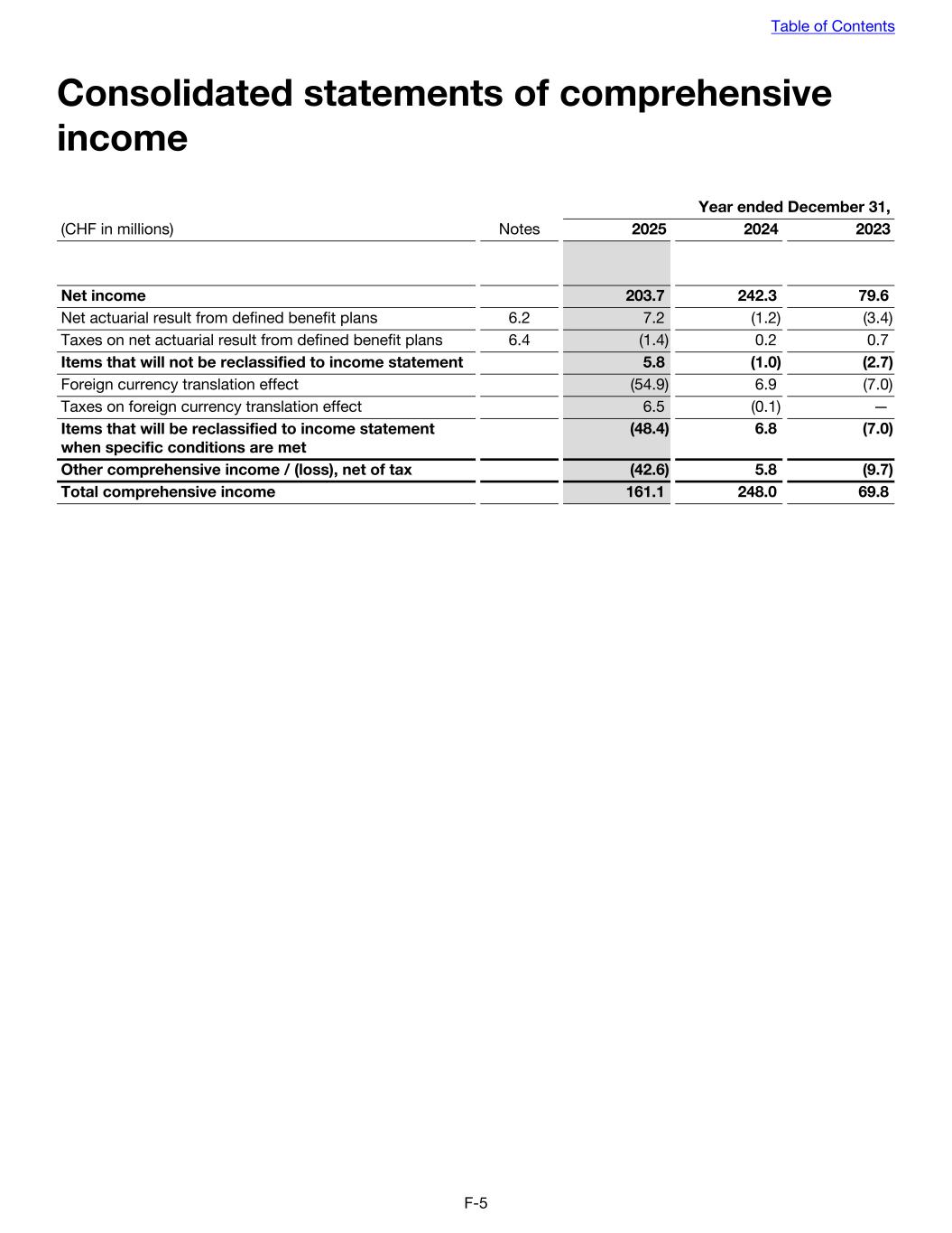 Consolidated statements of comprehensive income Year ended December 31, (CHF in millions) Notes 2025 2024 2023 Net income 203.7 242.3 79.6 Net actuarial result from defined benefit plans 6.2 7.2 (1.2) (3.4) Taxes on net actuarial result from defined benefit plans 6.4 (1.4) 0.2 0.7 Items that will not be reclassified to income statement 5.8 (1.0) (2.7) Foreign currency translation effect (54.9) 6.9 (7.0) Taxes on foreign currency translation effect 6.5 (0.1) — Items that will be reclassified to income statement when specific conditions are met (48.4) 6.8 (7.0) Other comprehensive income / (loss), net of tax (42.6) 5.8 (9.7) Total comprehensive income 161.1 248.0 69.8 Table of Contents F-5