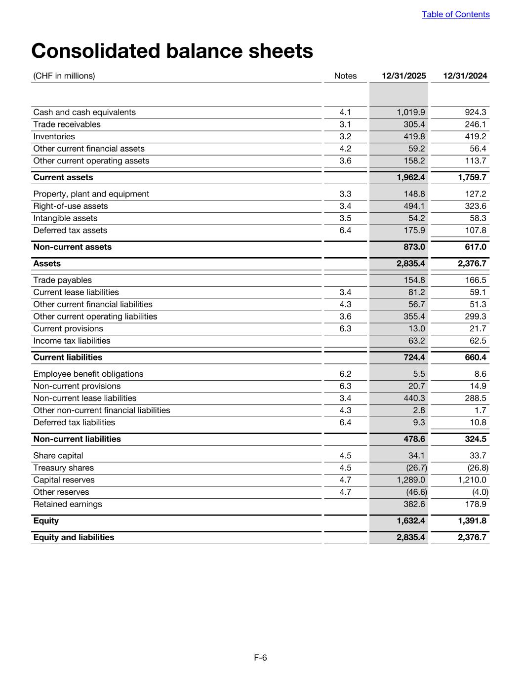 Consolidated balance sheets (CHF in millions) Notes 12/31/2025 12/31/2024 Cash and cash equivalents 4.1 1,019.9 924.3 Trade receivables 3.1 305.4 246.1 Inventories 3.2 419.8 419.2 Other current financial assets 4.2 59.2 56.4 Other current operating assets 3.6 158.2 113.7 Current assets 1,962.4 1,759.7 Property, plant and equipment 3.3 148.8 127.2 Right-of-use assets 3.4 494.1 323.6 Intangible assets 3.5 54.2 58.3 Deferred tax assets 6.4 175.9 107.8 Non-current assets 873.0 617.0 Assets 2,835.4 2,376.7 Trade payables 154.8 166.5 Current lease liabilities 3.4 81.2 59.1 Other current financial liabilities 4.3 56.7 51.3 Other current operating liabilities 3.6 355.4 299.3 Current provisions 6.3 13.0 21.7 Income tax liabilities 63.2 62.5 Current liabilities 724.4 660.4 Employee benefit obligations 6.2 5.5 8.6 Non-current provisions 6.3 20.7 14.9 Non-current lease liabilities 3.4 440.3 288.5 Other non-current financial liabilities 4.3 2.8 1.7 Deferred tax liabilities 6.4 9.3 10.8 Non-current liabilities 478.6 324.5 Share capital 4.5 34.1 33.7 Treasury shares 4.5 (26.7) (26.8) Capital reserves 4.7 1,289.0 1,210.0 Other reserves 4.7 (46.6) (4.0) Retained earnings 382.6 178.9 Equity 1,632.4 1,391.8 Equity and liabilities 2,835.4 2,376.7 Table of Contents F-6