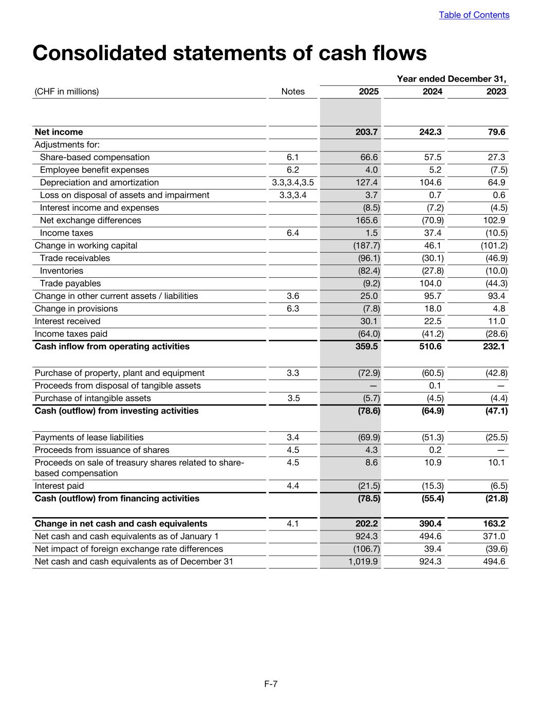 Consolidated statements of cash flows Year ended December 31, (CHF in millions) Notes 2025 2024 2023 Net income 203.7 242.3 79.6 Adjustments for: Share-based compensation 6.1 66.6 57.5 27.3 Employee benefit expenses 6.2 4.0 5.2 (7.5) Depreciation and amortization 3.3,3.4,3.5 127.4 104.6 64.9 Loss on disposal of assets and impairment 3.3,3.4 3.7 0.7 0.6 Interest income and expenses (8.5) (7.2) (4.5) Net exchange differences 165.6 (70.9) 102.9 Income taxes 6.4 1.5 37.4 (10.5) Change in working capital (187.7) 46.1 (101.2) Trade receivables (96.1) (30.1) (46.9) Inventories (82.4) (27.8) (10.0) Trade payables (9.2) 104.0 (44.3) Change in other current assets / liabilities 3.6 25.0 95.7 93.4 Change in provisions 6.3 (7.8) 18.0 4.8 Interest received 30.1 22.5 11.0 Income taxes paid (64.0) (41.2) (28.6) Cash inflow from operating activities 359.5 510.6 232.1 Purchase of property, plant and equipment 3.3 (72.9) (60.5) (42.8) Proceeds from disposal of tangible assets — 0.1 — Purchase of intangible assets 3.5 (5.7) (4.5) (4.4) Cash (outflow) from investing activities (78.6) (64.9) (47.1) Payments of lease liabilities 3.4 (69.9) (51.3) (25.5) Proceeds from issuance of shares 4.5 4.3 0.2 — Proceeds on sale of treasury shares related to share- based compensation 4.5 8.6 10.9 10.1 Interest paid 4.4 (21.5) (15.3) (6.5) Cash (outflow) from financing activities (78.5) (55.4) (21.8) Change in net cash and cash equivalents 4.1 202.2 390.4 163.2 Net cash and cash equivalents as of January 1 924.3 494.6 371.0 Net impact of foreign exchange rate differences (106.7) 39.4 (39.6) Net cash and cash equivalents as of December 31 1,019.9 924.3 494.6 Table of Contents F-7