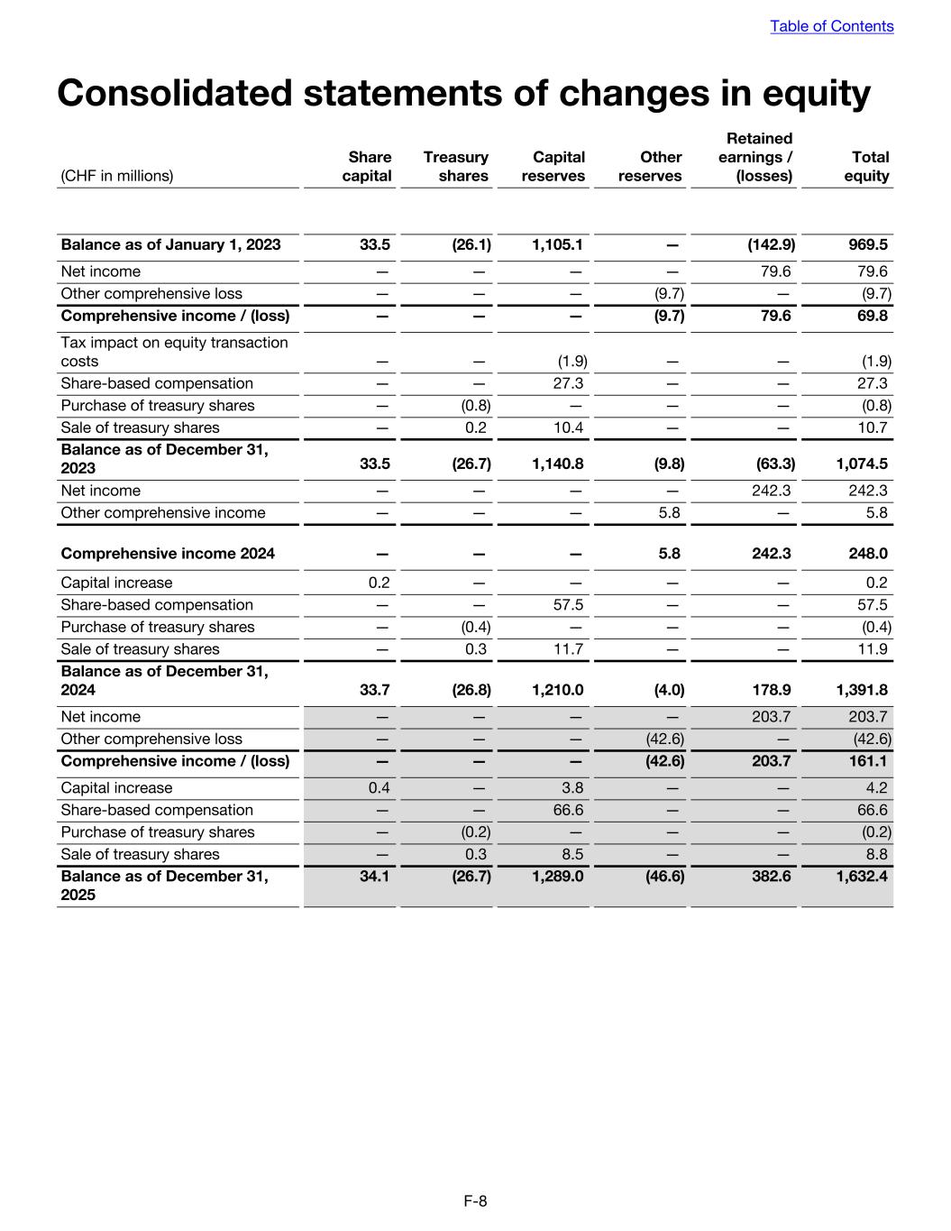 Consolidated statements of changes in equity (CHF in millions) Share capital Treasury shares Capital reserves Other reserves Retained earnings / (losses) Total equity Balance as of January 1, 2023 33.5 (26.1) 1,105.1 — (142.9) 969.5 Net income — — — — 79.6 79.6 Other comprehensive loss — — — (9.7) — (9.7) Comprehensive income / (loss) — — — (9.7) 79.6 69.8 Tax impact on equity transaction costs — — (1.9) — — (1.9) Share-based compensation — — 27.3 — — 27.3 Purchase of treasury shares — (0.8) — — — (0.8) Sale of treasury shares — 0.2 10.4 — — 10.7 Balance as of December 31, 2023 33.5 (26.7) 1,140.8 (9.8) (63.3) 1,074.5 Net income — — — — 242.3 242.3 Other comprehensive income — — — 5.8 — 5.8 Comprehensive income 2024 — — — 5.8 242.3 248.0 Capital increase 0.2 — — — — 0.2 Share-based compensation — — 57.5 — — 57.5 Purchase of treasury shares — (0.4) — — — (0.4) Sale of treasury shares — 0.3 11.7 — — 11.9 Balance as of December 31, 2024 33.7 (26.8) 1,210.0 (4.0) 178.9 1,391.8 Net income — — — — 203.7 203.7 Other comprehensive loss — — — (42.6) — (42.6) Comprehensive income / (loss) — — — (42.6) 203.7 161.1 Capital increase 0.4 — 3.8 — — 4.2 Share-based compensation — — 66.6 — — 66.6 Purchase of treasury shares — (0.2) — — — (0.2) Sale of treasury shares — 0.3 8.5 — — 8.8 Balance as of December 31, 2025 34.1 (26.7) 1,289.0 (46.6) 382.6 1,632.4 Table of Contents F-8