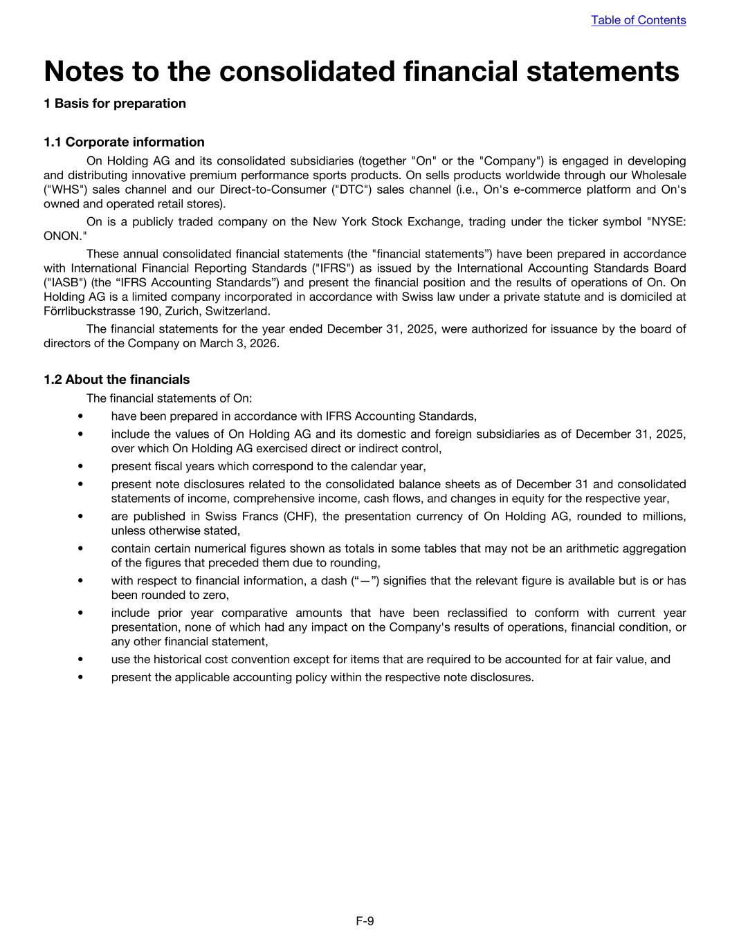 Notes to the consolidated financial statements 1 Basis for preparation 1.1 Corporate information On Holding AG and its consolidated subsidiaries (together "On" or the "Company") is engaged in developing and distributing innovative premium performance sports products. On sells products worldwide through our Wholesale ("WHS") sales channel and our Direct-to-Consumer ("DTC") sales channel (i.e., On's e-commerce platform and On's owned and operated retail stores). On is a publicly traded company on the New York Stock Exchange, trading under the ticker symbol "NYSE: ONON." These annual consolidated financial statements (the "financial statements”) have been prepared in accordance with International Financial Reporting Standards ("IFRS") as issued by the International Accounting Standards Board ("IASB") (the “IFRS Accounting Standards”) and present the financial position and the results of operations of On. On Holding AG is a limited company incorporated in accordance with Swiss law under a private statute and is domiciled at Förrlibuckstrasse 190, Zurich, Switzerland. The financial statements for the year ended December 31, 2025, were authorized for issuance by the board of directors of the Company on March 3, 2026. 1.2 About the financials The financial statements of On: • have been prepared in accordance with IFRS Accounting Standards, • include the values of On Holding AG and its domestic and foreign subsidiaries as of December 31, 2025, over which On Holding AG exercised direct or indirect control, • present fiscal years which correspond to the calendar year, • present note disclosures related to the consolidated balance sheets as of December 31 and consolidated statements of income, comprehensive income, cash flows, and changes in equity for the respective year, • are published in Swiss Francs (CHF), the presentation currency of On Holding AG, rounded to millions, unless otherwise stated, • contain certain numerical figures shown as totals in some tables that may not be an arithmetic aggregation of the figures that preceded them due to rounding, • with respect to financial information, a dash (“—”) signifies that the relevant figure is available but is or has been rounded to zero, • include prior year comparative amounts that have been reclassified to conform with current year presentation, none of which had any impact on the Company's results of operations, financial condition, or any other financial statement, • use the historical cost convention except for items that are required to be accounted for at fair value, and • present the applicable accounting policy within the respective note disclosures. Table of Contents F-9