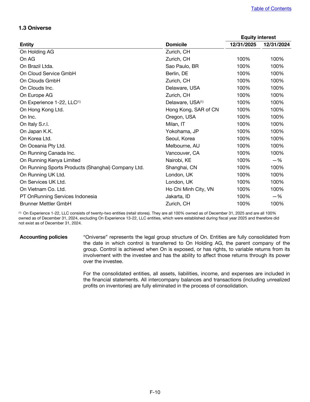 1.3 Oniverse Equity interest Entity Domicile 12/31/2025 12/31/2024 On Holding AG Zurich, CH On AG Zurich, CH 100% 100% On Brazil Ltda. Sao Paulo, BR 100% 100% On Cloud Service GmbH Berlin, DE 100% 100% On Clouds GmbH Zurich, CH 100% 100% On Clouds Inc. Delaware, USA 100% 100% On Europe AG Zurich, CH 100% 100% On Experience 1-22, LLC(1) Delaware, USA(1) 100% 100% On Hong Kong Ltd. Hong Kong, SAR of CN 100% 100% On Inc. Oregon, USA 100% 100% On Italy S.r.l. Milan, IT 100% 100% On Japan K.K. Yokohama, JP 100% 100% On Korea Ltd. Seoul, Korea 100% 100% On Oceania Pty Ltd. Melbourne, AU 100% 100% On Running Canada Inc. Vancouver, CA 100% 100% On Running Kenya Limited Nairobi, KE 100% —% On Running Sports Products (Shanghai) Company Ltd. Shanghai, CN 100% 100% On Running UK Ltd. London, UK 100% 100% On Services UK Ltd. London, UK 100% 100% On Vietnam Co. Ltd. Ho Chi Minh City, VN 100% 100% PT OnRunning Services Indonesia Jakarta, ID 100% —% Brunner Mettler GmbH Zurich, CH 100% 100% (1) On Experience 1-22, LLC consists of twenty-two entities (retail stores). They are all 100% owned as of December 31, 2025 and are all 100% owned as of December 31, 2024, excluding On Experience 13-22, LLC entities, which were established during fiscal year 2025 and therefore did not exist as of December 31, 2024. Accounting policies “Oniverse” represents the legal group structure of On. Entities are fully consolidated from the date in which control is transferred to On Holding AG, the parent company of the group. Control is achieved when On is exposed, or has rights, to variable returns from its involvement with the investee and has the ability to affect those returns through its power over the investee. For the consolidated entities, all assets, liabilities, income, and expenses are included in the financial statements. All intercompany balances and transactions (including unrealized profits on inventories) are fully eliminated in the process of consolidation. Table of Contents F-10