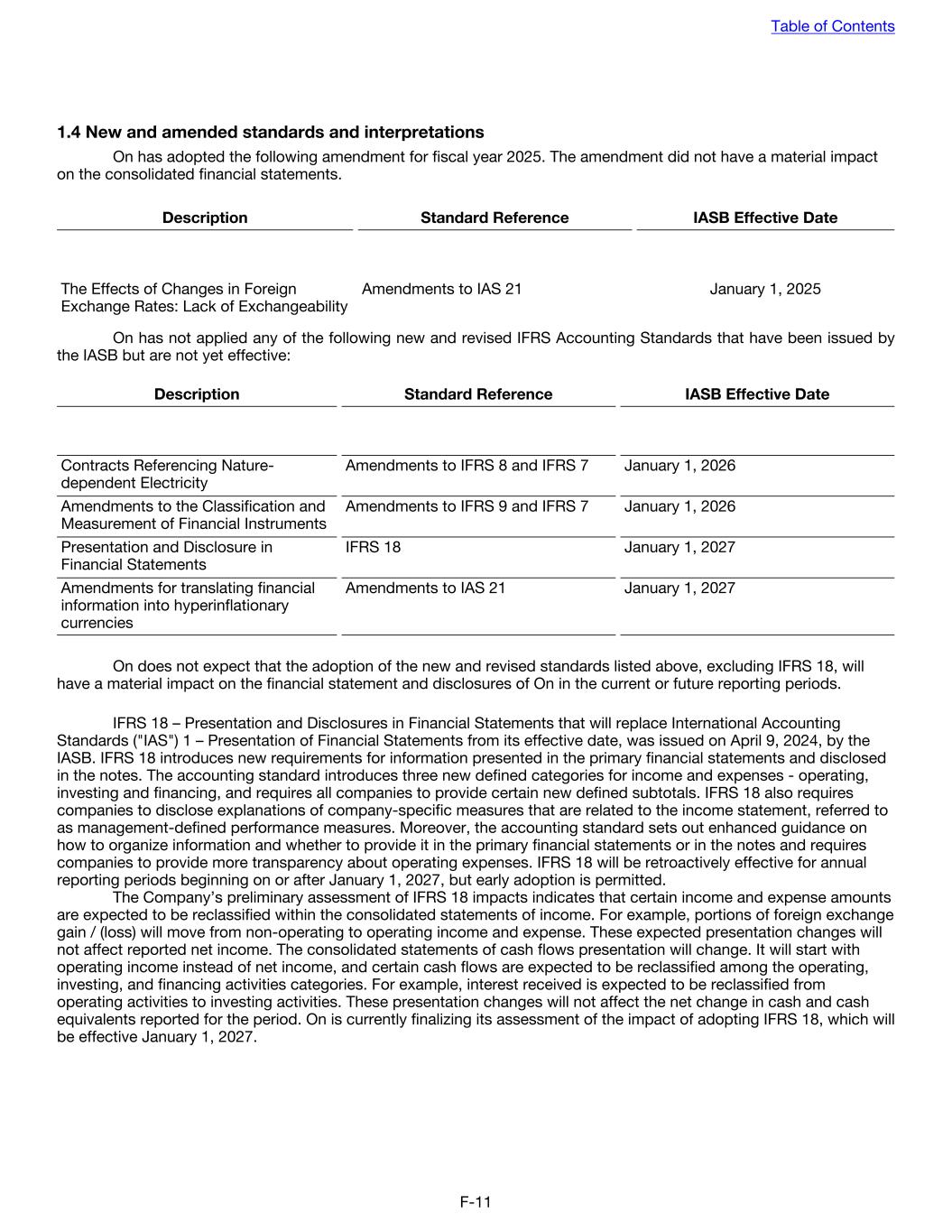 1.4 New and amended standards and interpretations On has adopted the following amendment for fiscal year 2025. The amendment did not have a material impact on the consolidated financial statements. Description Standard Reference IASB Effective Date The Effects of Changes in Foreign Exchange Rates: Lack of Exchangeability Amendments to IAS 21 January 1, 2025 On has not applied any of the following new and revised IFRS Accounting Standards that have been issued by the IASB but are not yet effective: Description Standard Reference IASB Effective Date Contracts Referencing Nature- dependent Electricity Amendments to IFRS 8 and IFRS 7 January 1, 2026 Amendments to the Classification and Measurement of Financial Instruments Amendments to IFRS 9 and IFRS 7 January 1, 2026 Presentation and Disclosure in Financial Statements IFRS 18 January 1, 2027 Amendments for translating financial information into hyperinflationary currencies Amendments to IAS 21 January 1, 2027 On does not expect that the adoption of the new and revised standards listed above, excluding IFRS 18, will have a material impact on the financial statement and disclosures of On in the current or future reporting periods. IFRS 18 – Presentation and Disclosures in Financial Statements that will replace International Accounting Standards ("IAS") 1 – Presentation of Financial Statements from its effective date, was issued on April 9, 2024, by the IASB. IFRS 18 introduces new requirements for information presented in the primary financial statements and disclosed in the notes. The accounting standard introduces three new defined categories for income and expenses - operating, investing and financing, and requires all companies to provide certain new defined subtotals. IFRS 18 also requires companies to disclose explanations of company-specific measures that are related to the income statement, referred to as management-defined performance measures. Moreover, the accounting standard sets out enhanced guidance on how to organize information and whether to provide it in the primary financial statements or in the notes and requires companies to provide more transparency about operating expenses. IFRS 18 will be retroactively effective for annual reporting periods beginning on or after January 1, 2027, but early adoption is permitted. The Company’s preliminary assessment of IFRS 18 impacts indicates that certain income and expense amounts are expected to be reclassified within the consolidated statements of income. For example, portions of foreign exchange gain / (loss) will move from non-operating to operating income and expense. These expected presentation changes will not affect reported net income. The consolidated statements of cash flows presentation will change. It will start with operating income instead of net income, and certain cash flows are expected to be reclassified among the operating, investing, and financing activities categories. For example, interest received is expected to be reclassified from operating activities to investing activities. These presentation changes will not affect the net change in cash and cash equivalents reported for the period. On is currently finalizing its assessment of the impact of adopting IFRS 18, which will be effective January 1, 2027. Table of Contents F-11