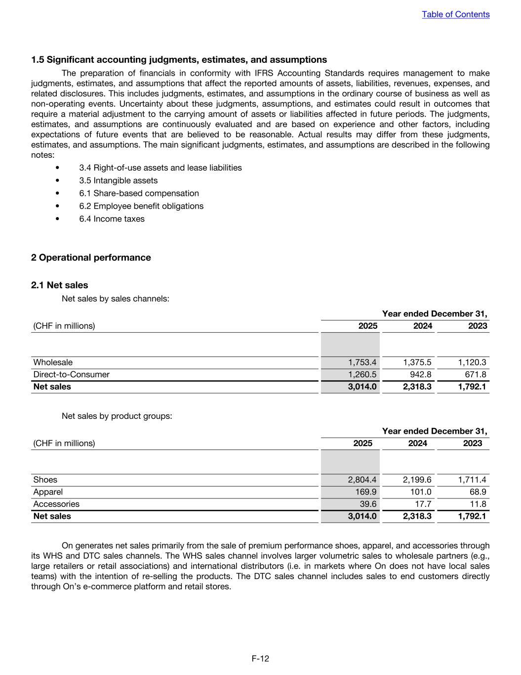 1.5 Significant accounting judgments, estimates, and assumptions The preparation of financials in conformity with IFRS Accounting Standards requires management to make judgments, estimates, and assumptions that affect the reported amounts of assets, liabilities, revenues, expenses, and related disclosures. This includes judgments, estimates, and assumptions in the ordinary course of business as well as non-operating events. Uncertainty about these judgments, assumptions, and estimates could result in outcomes that require a material adjustment to the carrying amount of assets or liabilities affected in future periods. The judgments, estimates, and assumptions are continuously evaluated and are based on experience and other factors, including expectations of future events that are believed to be reasonable. Actual results may differ from these judgments, estimates, and assumptions. The main significant judgments, estimates, and assumptions are described in the following notes: • 3.4 Right-of-use assets and lease liabilities • 3.5 Intangible assets • 6.1 Share-based compensation • 6.2 Employee benefit obligations • 6.4 Income taxes 2 Operational performance 2.1 Net sales Net sales by sales channels: Year ended December 31, (CHF in millions) 2025 2024 2023 Wholesale 1,753.4 1,375.5 1,120.3 Direct-to-Consumer 1,260.5 942.8 671.8 Net sales 3,014.0 2,318.3 1,792.1 Net sales by product groups: Year ended December 31, (CHF in millions) 2025 2024 2023 Shoes 2,804.4 2,199.6 1,711.4 Apparel 169.9 101.0 68.9 Accessories 39.6 17.7 11.8 Net sales 3,014.0 2,318.3 1,792.1 On generates net sales primarily from the sale of premium performance shoes, apparel, and accessories through its WHS and DTC sales channels. The WHS sales channel involves larger volumetric sales to wholesale partners (e.g., large retailers or retail associations) and international distributors (i.e. in markets where On does not have local sales teams) with the intention of re-selling the products. The DTC sales channel includes sales to end customers directly through On’s e-commerce platform and retail stores. Table of Contents F-12