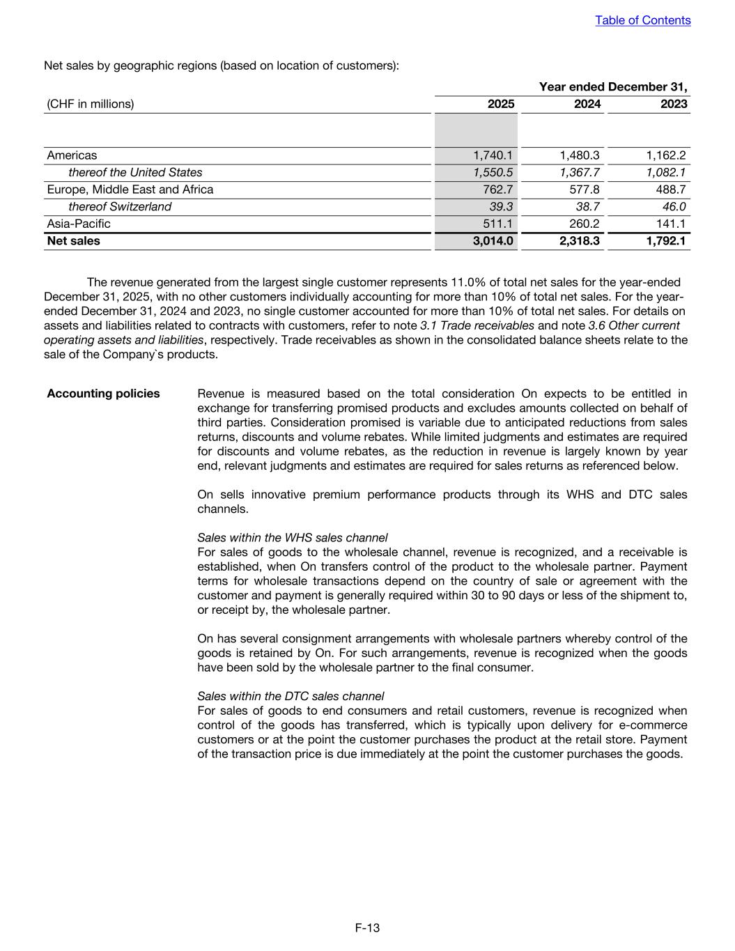 Net sales by geographic regions (based on location of customers): Year ended December 31, (CHF in millions) 2025 2024 2023 Americas 1,740.1 1,480.3 1,162.2 thereof the United States 1,550.5 1,367.7 1,082.1 Europe, Middle East and Africa 762.7 577.8 488.7 thereof Switzerland 39.3 38.7 46.0 Asia-Pacific 511.1 260.2 141.1 Net sales 3,014.0 2,318.3 1,792.1 The revenue generated from the largest single customer represents 11.0% of total net sales for the year-ended December 31, 2025, with no other customers individually accounting for more than 10% of total net sales. For the year- ended December 31, 2024 and 2023, no single customer accounted for more than 10% of total net sales. For details on assets and liabilities related to contracts with customers, refer to note 3.1 Trade receivables and note 3.6 Other current operating assets and liabilities, respectively. Trade receivables as shown in the consolidated balance sheets relate to the sale of the Company`s products. Accounting policies Revenue is measured based on the total consideration On expects to be entitled in exchange for transferring promised products and excludes amounts collected on behalf of third parties. Consideration promised is variable due to anticipated reductions from sales returns, discounts and volume rebates. While limited judgments and estimates are required for discounts and volume rebates, as the reduction in revenue is largely known by year end, relevant judgments and estimates are required for sales returns as referenced below. On sells innovative premium performance products through its WHS and DTC sales channels. Sales within the WHS sales channel For sales of goods to the wholesale channel, revenue is recognized, and a receivable is established, when On transfers control of the product to the wholesale partner. Payment terms for wholesale transactions depend on the country of sale or agreement with the customer and payment is generally required within 30 to 90 days or less of the shipment to, or receipt by, the wholesale partner. On has several consignment arrangements with wholesale partners whereby control of the goods is retained by On. For such arrangements, revenue is recognized when the goods have been sold by the wholesale partner to the final consumer. Sales within the DTC sales channel For sales of goods to end consumers and retail customers, revenue is recognized when control of the goods has transferred, which is typically upon delivery for e-commerce customers or at the point the customer purchases the product at the retail store. Payment of the transaction price is due immediately at the point the customer purchases the goods. Table of Contents F-13
