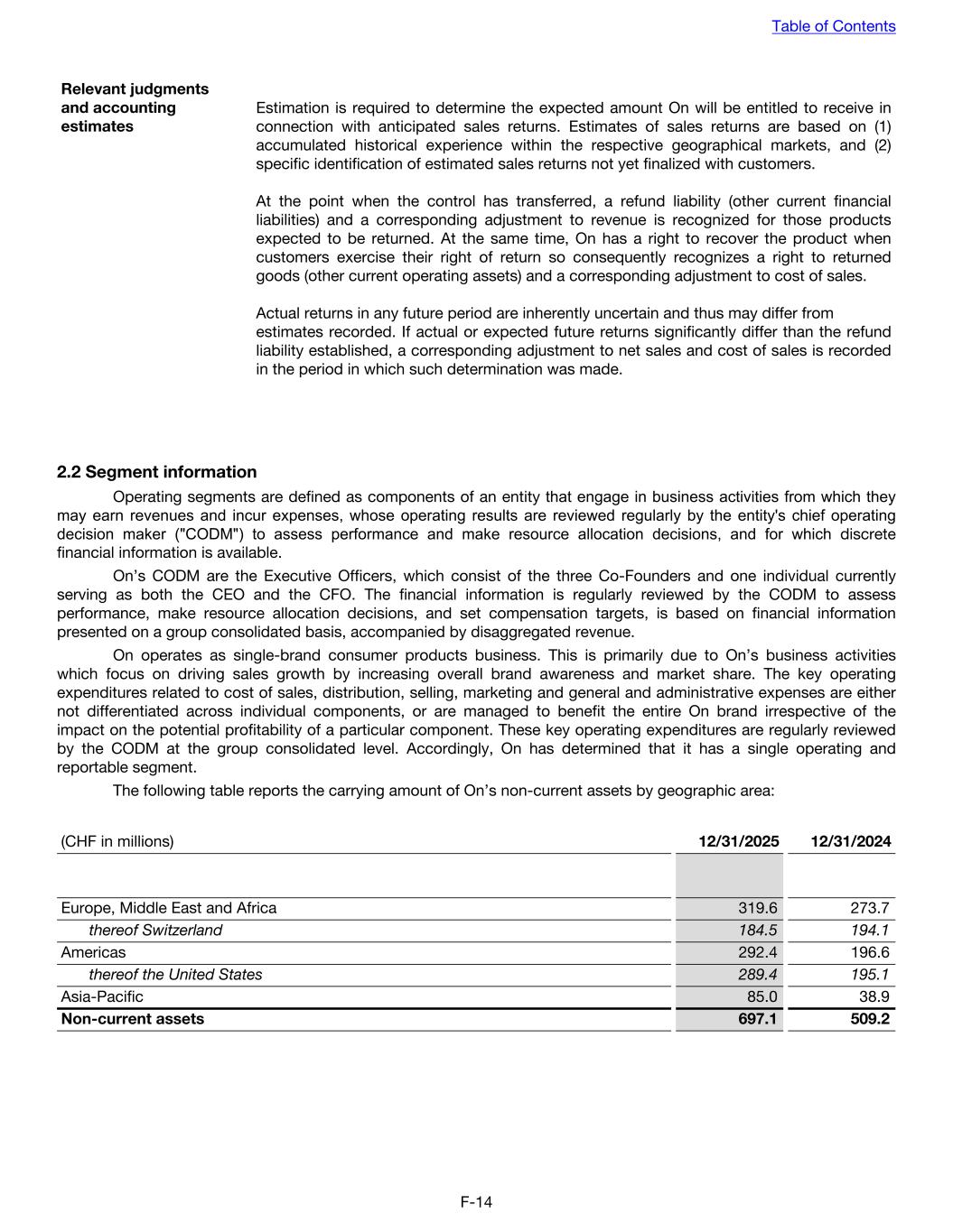Relevant judgments and accounting estimates Estimation is required to determine the expected amount On will be entitled to receive in connection with anticipated sales returns. Estimates of sales returns are based on (1) accumulated historical experience within the respective geographical markets, and (2) specific identification of estimated sales returns not yet finalized with customers. At the point when the control has transferred, a refund liability (other current financial liabilities) and a corresponding adjustment to revenue is recognized for those products expected to be returned. At the same time, On has a right to recover the product when customers exercise their right of return so consequently recognizes a right to returned goods (other current operating assets) and a corresponding adjustment to cost of sales. Actual returns in any future period are inherently uncertain and thus may differ from estimates recorded. If actual or expected future returns significantly differ than the refund liability established, a corresponding adjustment to net sales and cost of sales is recorded in the period in which such determination was made. 2.2 Segment information Operating segments are defined as components of an entity that engage in business activities from which they may earn revenues and incur expenses, whose operating results are reviewed regularly by the entity's chief operating decision maker ("CODM") to assess performance and make resource allocation decisions, and for which discrete financial information is available. On’s CODM are the Executive Officers, which consist of the three Co-Founders and one individual currently serving as both the CEO and the CFO. The financial information is regularly reviewed by the CODM to assess performance, make resource allocation decisions, and set compensation targets, is based on financial information presented on a group consolidated basis, accompanied by disaggregated revenue. On operates as single-brand consumer products business. This is primarily due to On’s business activities which focus on driving sales growth by increasing overall brand awareness and market share. The key operating expenditures related to cost of sales, distribution, selling, marketing and general and administrative expenses are either not differentiated across individual components, or are managed to benefit the entire On brand irrespective of the impact on the potential profitability of a particular component. These key operating expenditures are regularly reviewed by the CODM at the group consolidated level. Accordingly, On has determined that it has a single operating and reportable segment. The following table reports the carrying amount of On’s non-current assets by geographic area: (CHF in millions) 12/31/2025 12/31/2024 Europe, Middle East and Africa 319.6 273.7 thereof Switzerland 184.5 194.1 Americas 292.4 196.6 thereof the United States 289.4 195.1 Asia-Pacific 85.0 38.9 Non-current assets 697.1 509.2 Table of Contents F-14