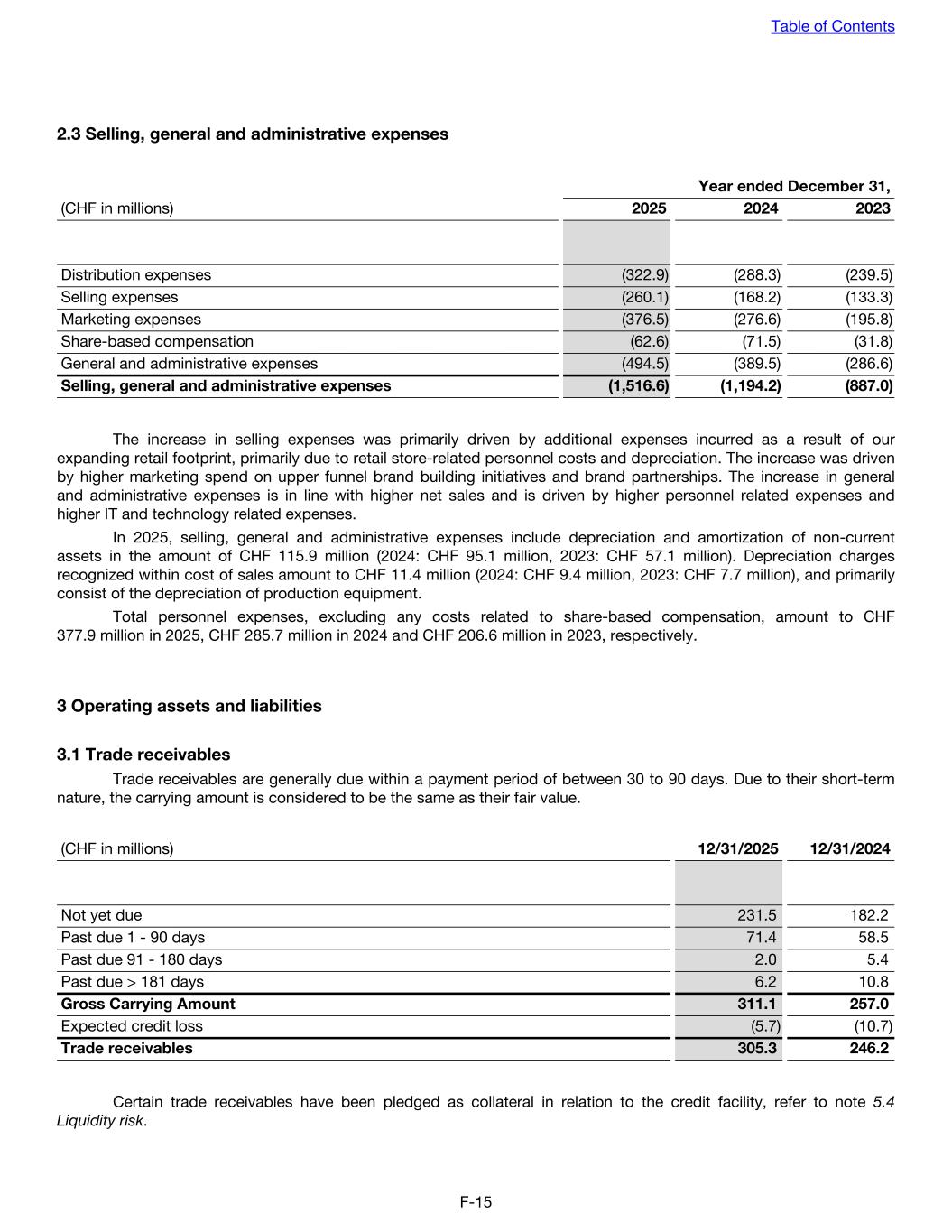 2.3 Selling, general and administrative expenses Year ended December 31, (CHF in millions) 2025 2024 2023 Distribution expenses (322.9) (288.3) (239.5) Selling expenses (260.1) (168.2) (133.3) Marketing expenses (376.5) (276.6) (195.8) Share-based compensation (62.6) (71.5) (31.8) General and administrative expenses (494.5) (389.5) (286.6) Selling, general and administrative expenses (1,516.6) (1,194.2) (887.0) The increase in selling expenses was primarily driven by additional expenses incurred as a result of our expanding retail footprint, primarily due to retail store-related personnel costs and depreciation. The increase was driven by higher marketing spend on upper funnel brand building initiatives and brand partnerships. The increase in general and administrative expenses is in line with higher net sales and is driven by higher personnel related expenses and higher IT and technology related expenses. In 2025, selling, general and administrative expenses include depreciation and amortization of non-current assets in the amount of CHF 115.9 million (2024: CHF 95.1 million, 2023: CHF 57.1 million). Depreciation charges recognized within cost of sales amount to CHF 11.4 million (2024: CHF 9.4 million, 2023: CHF 7.7 million), and primarily consist of the depreciation of production equipment. Total personnel expenses, excluding any costs related to share-based compensation, amount to CHF 377.9 million in 2025, CHF 285.7 million in 2024 and CHF 206.6 million in 2023, respectively. 3 Operating assets and liabilities 3.1 Trade receivables Trade receivables are generally due within a payment period of between 30 to 90 days. Due to their short-term nature, the carrying amount is considered to be the same as their fair value. (CHF in millions) 12/31/2025 12/31/2024 Not yet due 231.5 182.2 Past due 1 - 90 days 71.4 58.5 Past due 91 - 180 days 2.0 5.4 Past due > 181 days 6.2 10.8 Gross Carrying Amount 311.1 257.0 Expected credit loss (5.7) (10.7) Trade receivables 305.3 246.2 Certain trade receivables have been pledged as collateral in relation to the credit facility, refer to note 5.4 Liquidity risk. Table of Contents F-15