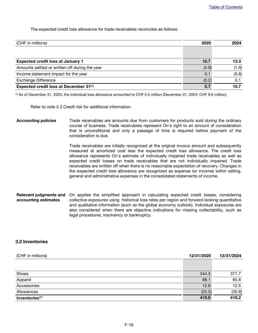 The expected credit loss allowance for trade receivables reconciles as follows: (CHF in millions) 2025 2024 Expected credit loss at January 1 10.7 13.3 Amounts settled or written off during the year (4.9) (1.9) Income statement impact for the year 0.1 (0.8) Exchange Difference (0.2) 0.1 Expected credit loss at December 31(1) 5.7 10.7 (1) As of December 31, 2025, the individual loss allowance amounted to CHF 5.5 million (December 31, 2024: CHF 9.6 million). Refer to note 5.3 Credit risk for additional information. Accounting policies Trade receivables are amounts due from customers for products sold during the ordinary course of business. Trade receivables represent On’s right to an amount of consideration that is unconditional and only a passage of time is required before payment of the consideration is due. Trade receivables are initially recognized at the original invoice amount and subsequently measured at amortized cost less the expected credit loss allowance. The credit loss allowance represents On's estimate of individually impaired trade receivables as well as expected credit losses on trade receivables that are not individually impaired. Trade receivables are written off when there is no reasonable expectation of recovery. Changes in the expected credit loss allowance are recognized as expense (or income) within selling, general and administrative expenses in the consolidated statements of income. Relevant judgments and accounting estimates On applies the simplified approach in calculating expected credit losses, considering collective exposures using historical loss rates per region and forward-looking quantitative and qualitative information (such as the global economy outlook). Individual exposures are also considered when there are objective indications for missing collectability, such as legal procedures, insolvency or bankruptcy. 3.2 Inventories (CHF in millions) 12/31/2025 12/31/2024 Shoes 344.3 371.7 Apparel 88.1 65.8 Accessories 12.8 12.5 Allowances (25.5) (30.8) Inventories(1) 419.8 419.2 Table of Contents F-16