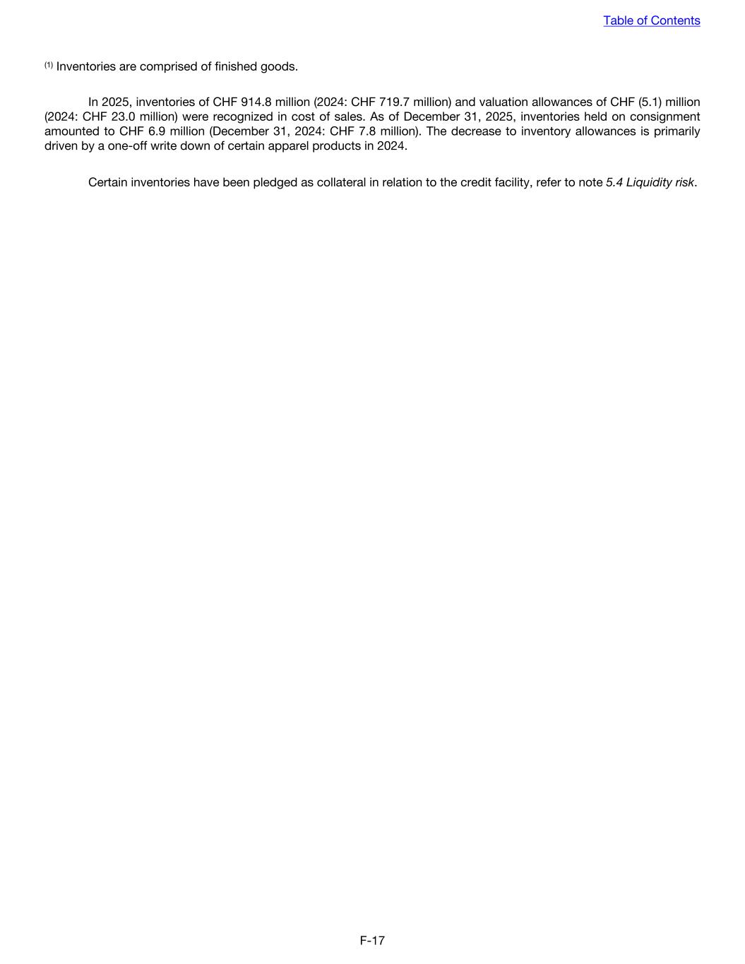 (1) Inventories are comprised of finished goods. In 2025, inventories of CHF 914.8 million (2024: CHF 719.7 million) and valuation allowances of CHF (5.1) million (2024: CHF 23.0 million) were recognized in cost of sales. As of December 31, 2025, inventories held on consignment amounted to CHF 6.9 million (December 31, 2024: CHF 7.8 million). The decrease to inventory allowances is primarily driven by a one-off write down of certain apparel products in 2024. Certain inventories have been pledged as collateral in relation to the credit facility, refer to note 5.4 Liquidity risk. Table of Contents F-17