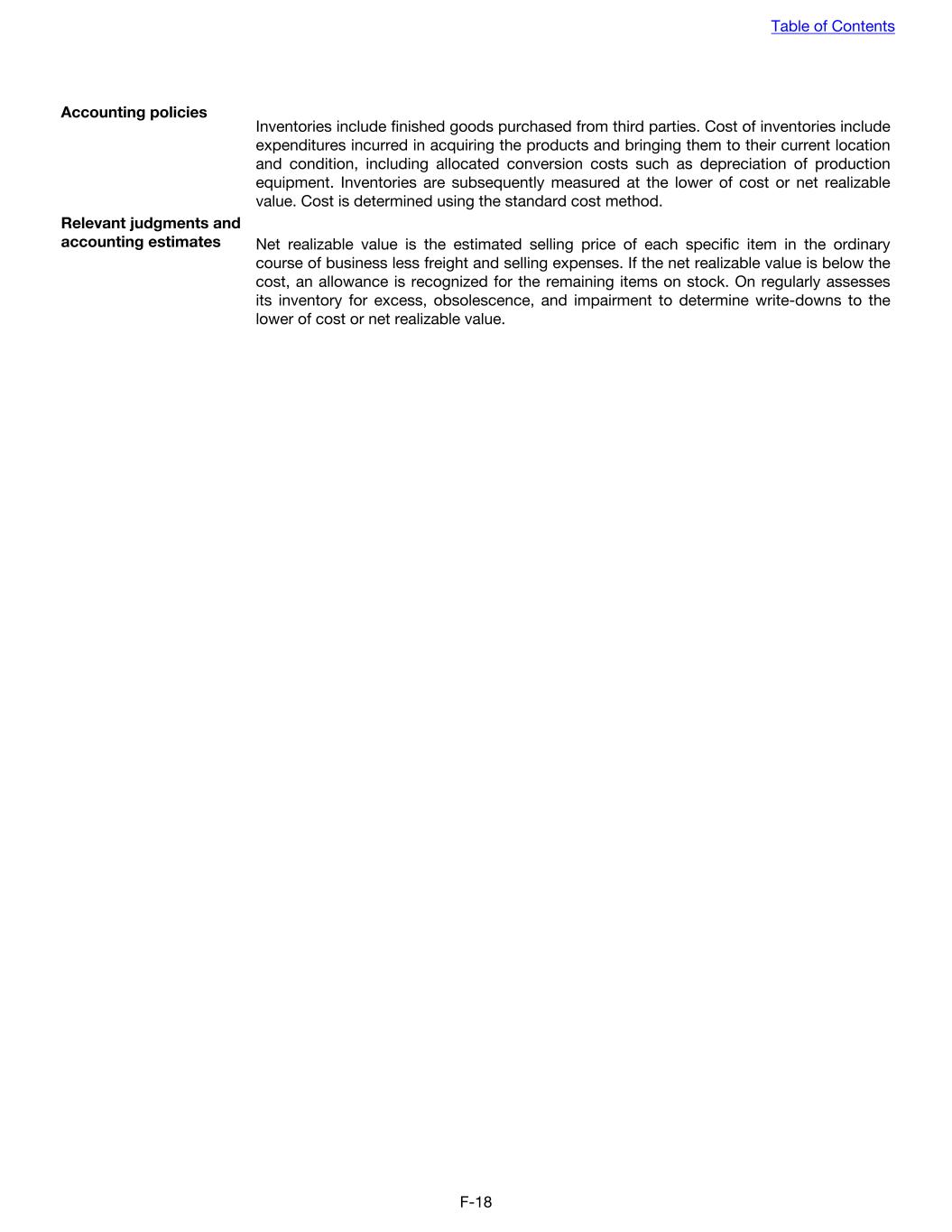 Accounting policies Inventories include finished goods purchased from third parties. Cost of inventories include expenditures incurred in acquiring the products and bringing them to their current location and condition, including allocated conversion costs such as depreciation of production equipment. Inventories are subsequently measured at the lower of cost or net realizable value. Cost is determined using the standard cost method. Relevant judgments and accounting estimates Net realizable value is the estimated selling price of each specific item in the ordinary course of business less freight and selling expenses. If the net realizable value is below the cost, an allowance is recognized for the remaining items on stock. On regularly assesses its inventory for excess, obsolescence, and impairment to determine write-downs to the lower of cost or net realizable value. Table of Contents F-18