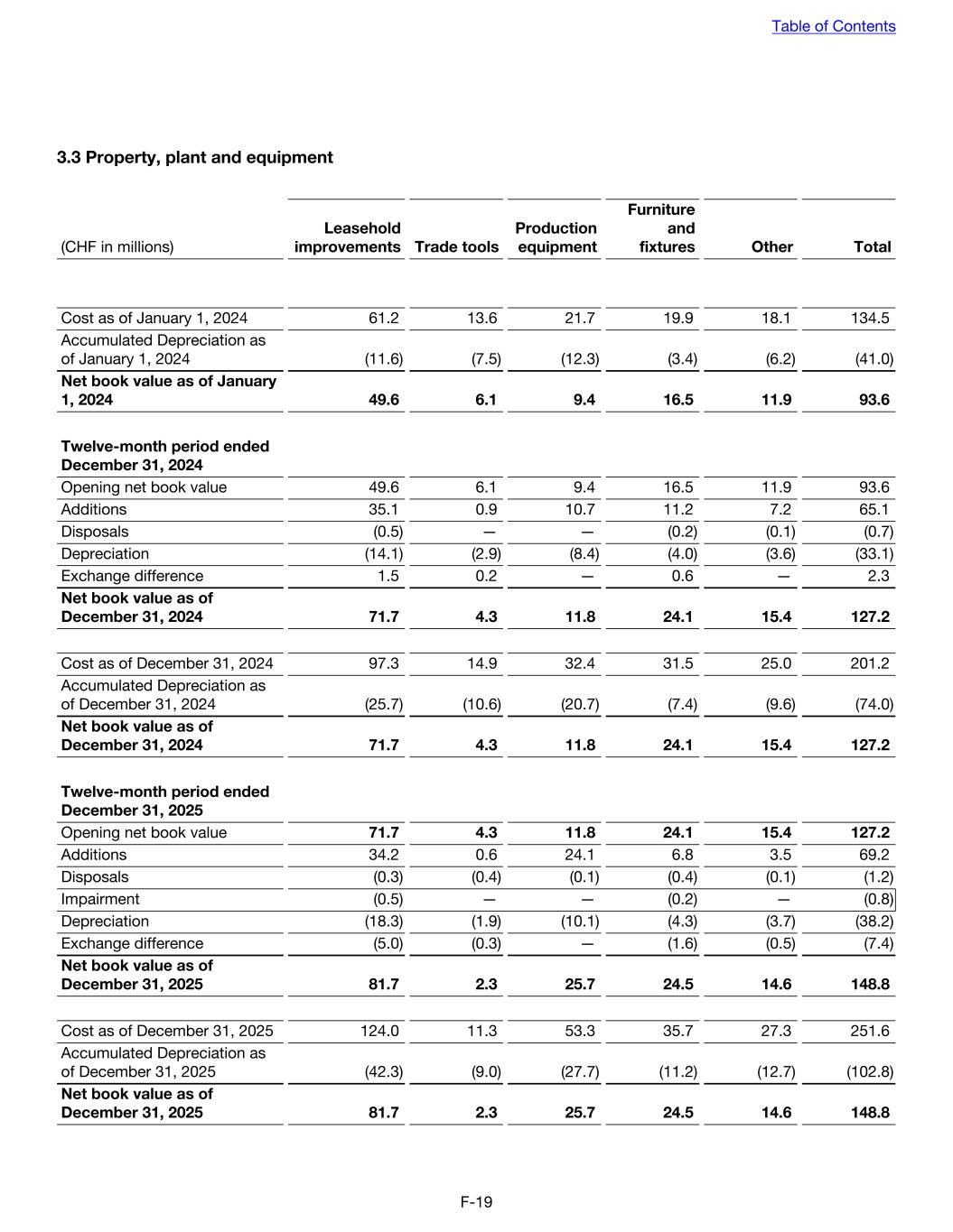 3.3 Property, plant and equipment (CHF in millions) Leasehold improvements Trade tools Production equipment Furniture and fixtures Other Total Cost as of January 1, 2024 61.2 13.6 21.7 19.9 18.1 134.5 Accumulated Depreciation as of January 1, 2024 (11.6) (7.5) (12.3) (3.4) (6.2) (41.0) Net book value as of January 1, 2024 49.6 6.1 9.4 16.5 11.9 93.6 Twelve-month period ended December 31, 2024 Opening net book value 49.6 6.1 9.4 16.5 11.9 93.6 Additions 35.1 0.9 10.7 11.2 7.2 65.1 Disposals (0.5) — — (0.2) (0.1) (0.7) Depreciation (14.1) (2.9) (8.4) (4.0) (3.6) (33.1) Exchange difference 1.5 0.2 — 0.6 — 2.3 Net book value as of December 31, 2024 71.7 4.3 11.8 24.1 15.4 127.2 Cost as of December 31, 2024 97.3 14.9 32.4 31.5 25.0 201.2 Accumulated Depreciation as of December 31, 2024 (25.7) (10.6) (20.7) (7.4) (9.6) (74.0) Net book value as of December 31, 2024 71.7 4.3 11.8 24.1 15.4 127.2 Twelve-month period ended December 31, 2025 Opening net book value 71.7 4.3 11.8 24.1 15.4 127.2 Additions 34.2 0.6 24.1 6.8 3.5 69.2 Disposals (0.3) (0.4) (0.1) (0.4) (0.1) (1.2) Impairment (0.5) — — (0.2) — (0.8) Depreciation (18.3) (1.9) (10.1) (4.3) (3.7) (38.2) Exchange difference (5.0) (0.3) — (1.6) (0.5) (7.4) Net book value as of December 31, 2025 81.7 2.3 25.7 24.5 14.6 148.8 Cost as of December 31, 2025 124.0 11.3 53.3 35.7 27.3 251.6 Accumulated Depreciation as of December 31, 2025 (42.3) (9.0) (27.7) (11.2) (12.7) (102.8) Net book value as of December 31, 2025 81.7 2.3 25.7 24.5 14.6 148.8 Table of Contents F-19