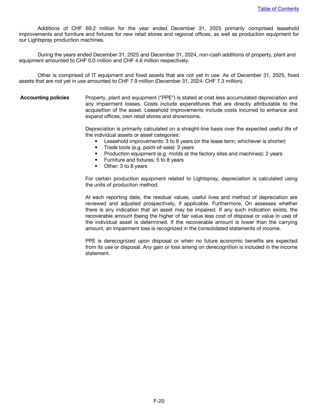 Additions of CHF 69.2 million for the year ended December 31, 2025 primarily comprised leasehold improvements and furniture and fixtures for new retail stores and regional offices, as well as production equipment for our Lightspray production machines. During the years ended December 31, 2025 and December 31, 2024, non-cash additions of property, plant and equipment amounted to CHF 0.0 million and CHF 4.6 million respectively. Other is comprised of IT equipment and fixed assets that are not yet in use. As of December 31, 2025, fixed assets that are not yet in use amounted to CHF 7.9 million (December 31, 2024: CHF 7.3 million). Accounting policies Property, plant and equipment ("PPE") is stated at cost less accumulated depreciation and any impairment losses. Costs include expenditures that are directly attributable to the acquisition of the asset. Leasehold improvements include costs incurred to enhance and expand offices, own retail stores and showrooms. Depreciation is primarily calculated on a straight-line basis over the expected useful life of the individual assets or asset categories: • Leasehold improvements: 3 to 8 years (or the lease term, whichever is shorter) • Trade tools (e.g. point-of-sale): 3 years • Production equipment (e.g. molds at the factory sites and machines): 2 years • Furniture and fixtures: 5 to 8 years • Other: 3 to 8 years For certain production equipment related to Lightspray, depreciation is calculated using the units of production method. At each reporting date, the residual values, useful lives and method of depreciation are reviewed and adjusted prospectively, if applicable. Furthermore, On assesses whether there is any indication that an asset may be impaired. If any such indication exists, the recoverable amount (being the higher of fair value less cost of disposal or value in use) of the individual asset is determined. If the recoverable amount is lower than the carrying amount, an impairment loss is recognized in the consolidated statements of income. PPE is derecognized upon disposal or when no future economic benefits are expected from its use or disposal. Any gain or loss arising on derecognition is included in the income statement. Table of Contents F-20