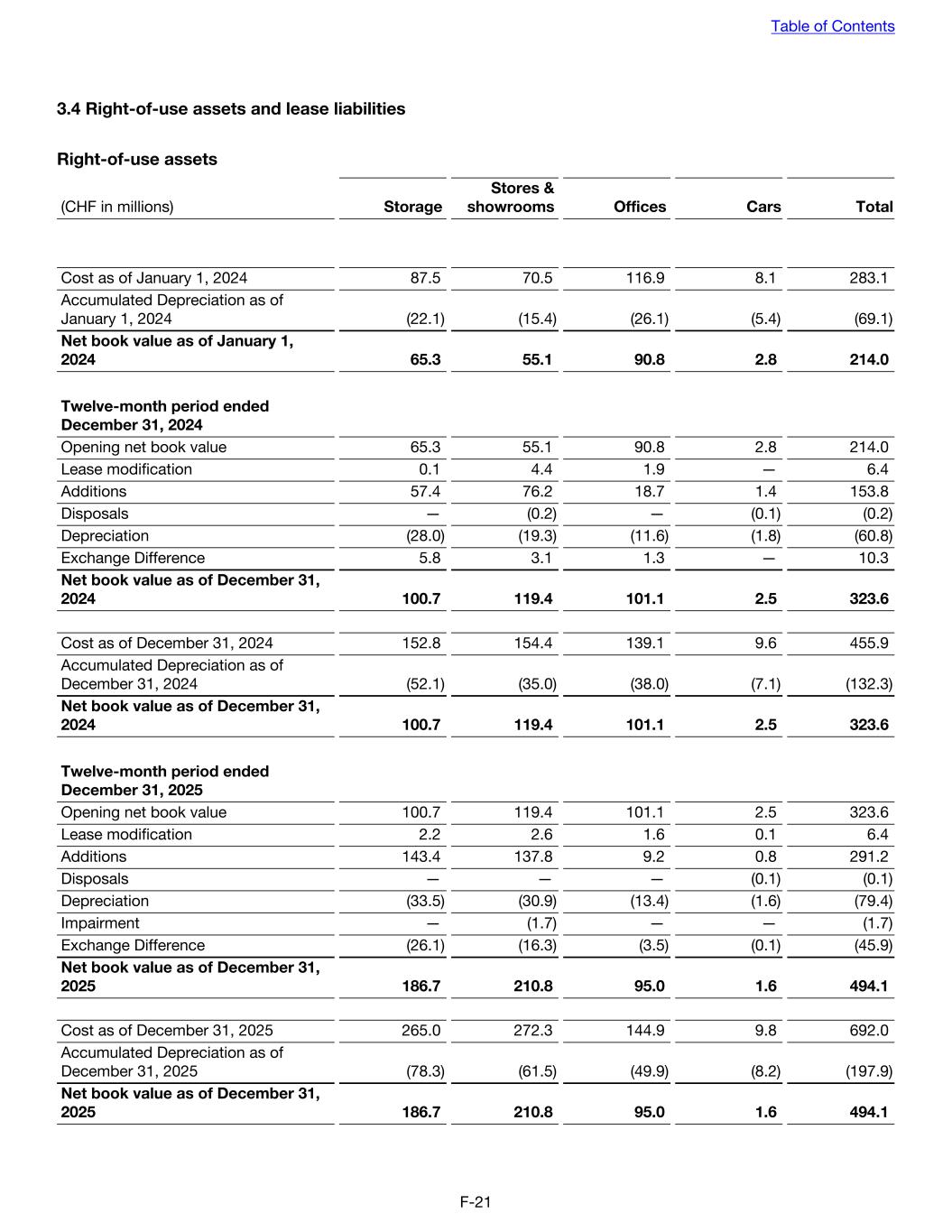 3.4 Right-of-use assets and lease liabilities Right-of-use assets (CHF in millions) Storage Stores & showrooms Offices Cars Total Cost as of January 1, 2024 87.5 70.5 116.9 8.1 283.1 Accumulated Depreciation as of January 1, 2024 (22.1) (15.4) (26.1) (5.4) (69.1) Net book value as of January 1, 2024 65.3 55.1 90.8 2.8 214.0 Twelve-month period ended December 31, 2024 Opening net book value 65.3 55.1 90.8 2.8 214.0 Lease modification 0.1 4.4 1.9 — 6.4 Additions 57.4 76.2 18.7 1.4 153.8 Disposals — (0.2) — (0.1) (0.2) Depreciation (28.0) (19.3) (11.6) (1.8) (60.8) Exchange Difference 5.8 3.1 1.3 — 10.3 Net book value as of December 31, 2024 100.7 119.4 101.1 2.5 323.6 Cost as of December 31, 2024 152.8 154.4 139.1 9.6 455.9 Accumulated Depreciation as of December 31, 2024 (52.1) (35.0) (38.0) (7.1) (132.3) Net book value as of December 31, 2024 100.7 119.4 101.1 2.5 323.6 Twelve-month period ended December 31, 2025 Opening net book value 100.7 119.4 101.1 2.5 323.6 Lease modification 2.2 2.6 1.6 0.1 6.4 Additions 143.4 137.8 9.2 0.8 291.2 Disposals — — — (0.1) (0.1) Depreciation (33.5) (30.9) (13.4) (1.6) (79.4) Impairment — (1.7) — — (1.7) Exchange Difference (26.1) (16.3) (3.5) (0.1) (45.9) Net book value as of December 31, 2025 186.7 210.8 95.0 1.6 494.1 Cost as of December 31, 2025 265.0 272.3 144.9 9.8 692.0 Accumulated Depreciation as of December 31, 2025 (78.3) (61.5) (49.9) (8.2) (197.9) Net book value as of December 31, 2025 186.7 210.8 95.0 1.6 494.1 Table of Contents F-21