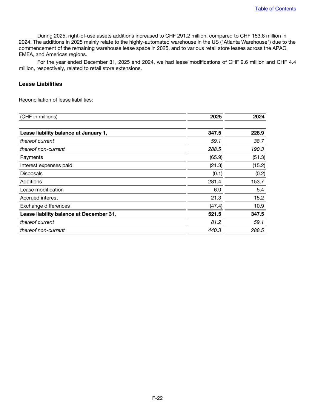 During 2025, right-of-use assets additions increased to CHF 291.2 million, compared to CHF 153.8 million in 2024. The additions in 2025 mainly relate to the highly-automated warehouse in the US ("Atlanta Warehouse") due to the commencement of the remaining warehouse lease space in 2025, and to various retail store leases across the APAC, EMEA, and Americas regions. For the year ended December 31, 2025 and 2024, we had lease modifications of CHF 2.6 million and CHF 4.4 million, respectively, related to retail store extensions. Lease Liabilities Reconciliation of lease liabilities: (CHF in millions) 2025 2024 Lease liability balance at January 1, 347.5 228.9 thereof current 59.1 38.7 thereof non-current 288.5 190.3 Payments (65.9) (51.3) Interest expenses paid (21.3) (15.2) Disposals (0.1) (0.2) Additions 281.4 153.7 Lease modification 6.0 5.4 Accrued interest 21.3 15.2 Exchange differences (47.4) 10.9 Lease liability balance at December 31, 521.5 347.5 thereof current 81.2 59.1 thereof non-current 440.3 288.5 Table of Contents F-22