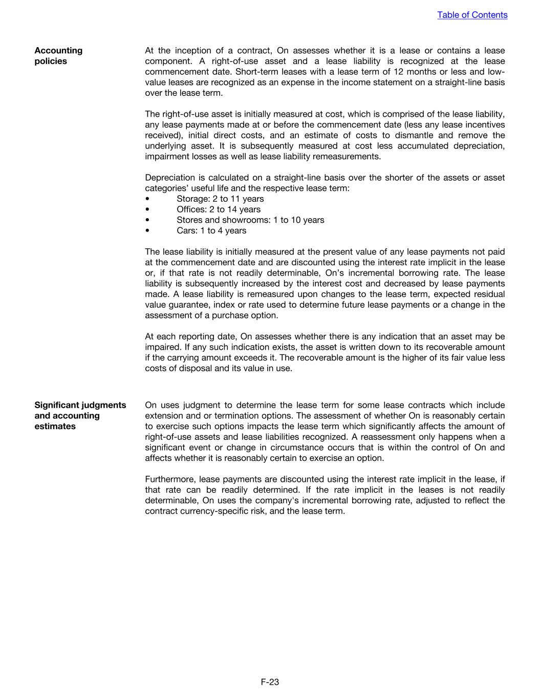 Accounting policies At the inception of a contract, On assesses whether it is a lease or contains a lease component. A right-of-use asset and a lease liability is recognized at the lease commencement date. Short-term leases with a lease term of 12 months or less and low- value leases are recognized as an expense in the income statement on a straight-line basis over the lease term. The right-of-use asset is initially measured at cost, which is comprised of the lease liability, any lease payments made at or before the commencement date (less any lease incentives received), initial direct costs, and an estimate of costs to dismantle and remove the underlying asset. It is subsequently measured at cost less accumulated depreciation, impairment losses as well as lease liability remeasurements. Depreciation is calculated on a straight-line basis over the shorter of the assets or asset categories’ useful life and the respective lease term: • Storage: 2 to 11 years • Offices: 2 to 14 years • Stores and showrooms: 1 to 10 years • Cars: 1 to 4 years The lease liability is initially measured at the present value of any lease payments not paid at the commencement date and are discounted using the interest rate implicit in the lease or, if that rate is not readily determinable, On’s incremental borrowing rate. The lease liability is subsequently increased by the interest cost and decreased by lease payments made. A lease liability is remeasured upon changes to the lease term, expected residual value guarantee, index or rate used to determine future lease payments or a change in the assessment of a purchase option. At each reporting date, On assesses whether there is any indication that an asset may be impaired. If any such indication exists, the asset is written down to its recoverable amount if the carrying amount exceeds it. The recoverable amount is the higher of its fair value less costs of disposal and its value in use. Significant judgments and accounting estimates On uses judgment to determine the lease term for some lease contracts which include extension and or termination options. The assessment of whether On is reasonably certain to exercise such options impacts the lease term which significantly affects the amount of right-of-use assets and lease liabilities recognized. A reassessment only happens when a significant event or change in circumstance occurs that is within the control of On and affects whether it is reasonably certain to exercise an option. Furthermore, lease payments are discounted using the interest rate implicit in the lease, if that rate can be readily determined. If the rate implicit in the leases is not readily determinable, On uses the company's incremental borrowing rate, adjusted to reflect the contract currency-specific risk, and the lease term. Table of Contents F-23