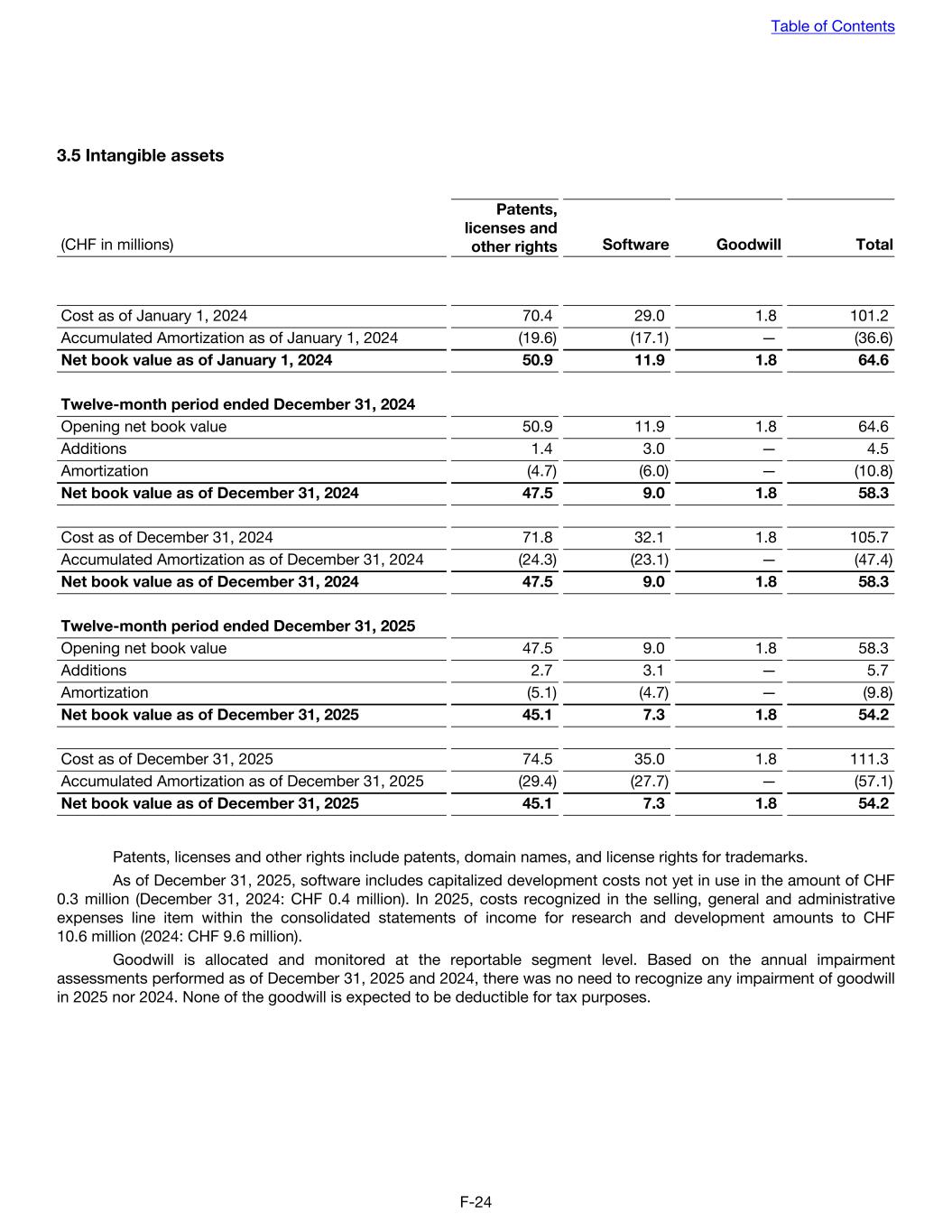 3.5 Intangible assets (CHF in millions) Patents, licenses and other rights Software Goodwill Total Cost as of January 1, 2024 70.4 29.0 1.8 101.2 Accumulated Amortization as of January 1, 2024 (19.6) (17.1) — (36.6) Net book value as of January 1, 2024 50.9 11.9 1.8 64.6 Twelve-month period ended December 31, 2024 Opening net book value 50.9 11.9 1.8 64.6 Additions 1.4 3.0 — 4.5 Amortization (4.7) (6.0) — (10.8) Net book value as of December 31, 2024 47.5 9.0 1.8 58.3 Cost as of December 31, 2024 71.8 32.1 1.8 105.7 Accumulated Amortization as of December 31, 2024 (24.3) (23.1) — (47.4) Net book value as of December 31, 2024 47.5 9.0 1.8 58.3 Twelve-month period ended December 31, 2025 Opening net book value 47.5 9.0 1.8 58.3 Additions 2.7 3.1 — 5.7 Amortization (5.1) (4.7) — (9.8) Net book value as of December 31, 2025 45.1 7.3 1.8 54.2 Cost as of December 31, 2025 74.5 35.0 1.8 111.3 Accumulated Amortization as of December 31, 2025 (29.4) (27.7) — (57.1) Net book value as of December 31, 2025 45.1 7.3 1.8 54.2 Patents, licenses and other rights include patents, domain names, and license rights for trademarks. As of December 31, 2025, software includes capitalized development costs not yet in use in the amount of CHF 0.3 million (December 31, 2024: CHF 0.4 million). In 2025, costs recognized in the selling, general and administrative expenses line item within the consolidated statements of income for research and development amounts to CHF 10.6 million (2024: CHF 9.6 million). Goodwill is allocated and monitored at the reportable segment level. Based on the annual impairment assessments performed as of December 31, 2025 and 2024, there was no need to recognize any impairment of goodwill in 2025 nor 2024. None of the goodwill is expected to be deductible for tax purposes. Table of Contents F-24