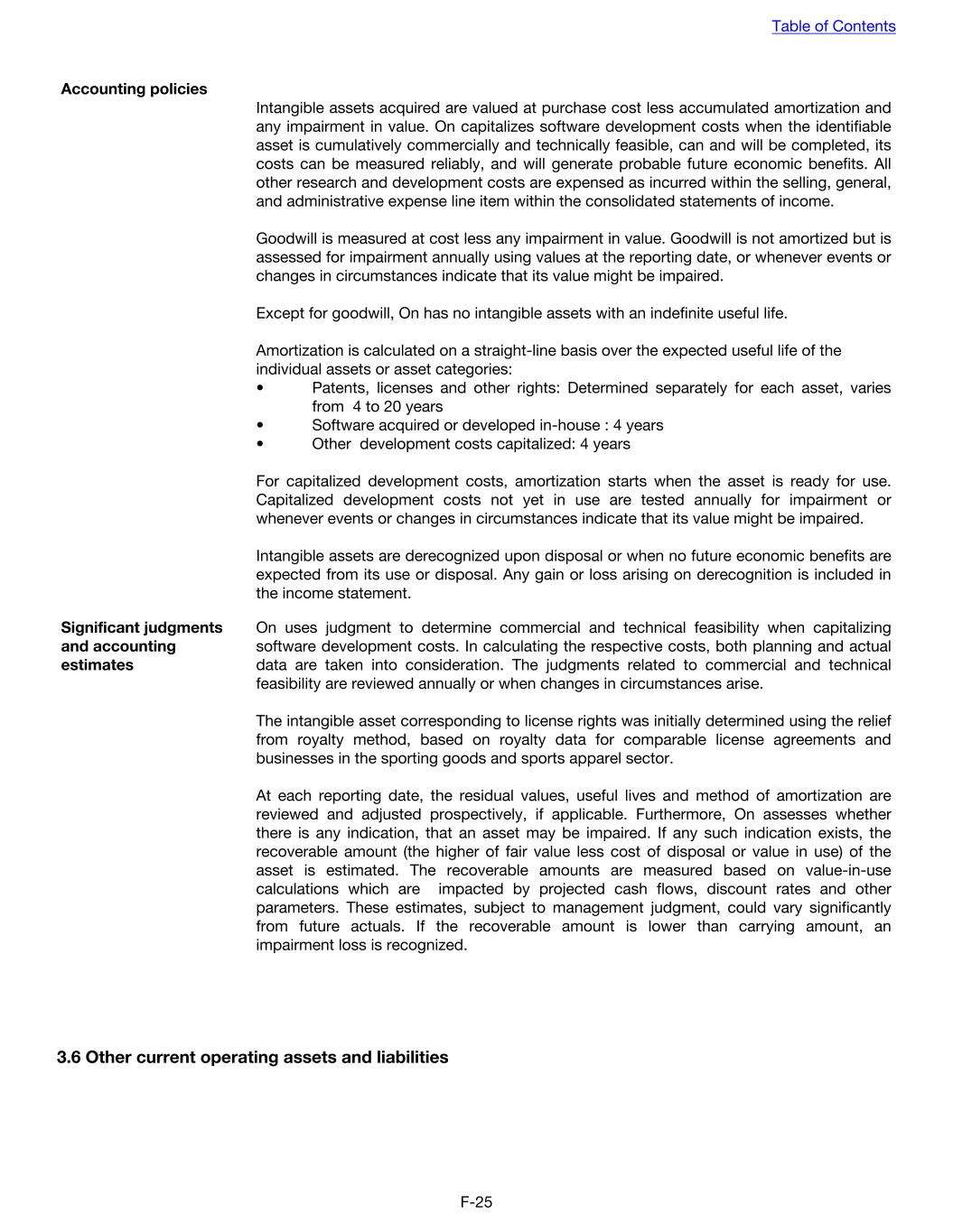 Accounting policies Intangible assets acquired are valued at purchase cost less accumulated amortization and any impairment in value. On capitalizes software development costs when the identifiable asset is cumulatively commercially and technically feasible, can and will be completed, its costs can be measured reliably, and will generate probable future economic benefits. All other research and development costs are expensed as incurred within the selling, general, and administrative expense line item within the consolidated statements of income. Goodwill is measured at cost less any impairment in value. Goodwill is not amortized but is assessed for impairment annually using values at the reporting date, or whenever events or changes in circumstances indicate that its value might be impaired. Except for goodwill, On has no intangible assets with an indefinite useful life. Amortization is calculated on a straight-line basis over the expected useful life of the individual assets or asset categories: • Patents, licenses and other rights: Determined separately for each asset, varies from 4 to 20 years • Software acquired or developed in-house : 4 years • Other development costs capitalized: 4 years For capitalized development costs, amortization starts when the asset is ready for use. Capitalized development costs not yet in use are tested annually for impairment or whenever events or changes in circumstances indicate that its value might be impaired. Intangible assets are derecognized upon disposal or when no future economic benefits are expected from its use or disposal. Any gain or loss arising on derecognition is included in the income statement. Significant judgments and accounting estimates On uses judgment to determine commercial and technical feasibility when capitalizing software development costs. In calculating the respective costs, both planning and actual data are taken into consideration. The judgments related to commercial and technical feasibility are reviewed annually or when changes in circumstances arise. The intangible asset corresponding to license rights was initially determined using the relief from royalty method, based on royalty data for comparable license agreements and businesses in the sporting goods and sports apparel sector. At each reporting date, the residual values, useful lives and method of amortization are reviewed and adjusted prospectively, if applicable. Furthermore, On assesses whether there is any indication, that an asset may be impaired. If any such indication exists, the recoverable amount (the higher of fair value less cost of disposal or value in use) of the asset is estimated. The recoverable amounts are measured based on value-in-use calculations which are impacted by projected cash flows, discount rates and other parameters. These estimates, subject to management judgment, could vary significantly from future actuals. If the recoverable amount is lower than carrying amount, an impairment loss is recognized. 3.6 Other current operating assets and liabilities Table of Contents F-25