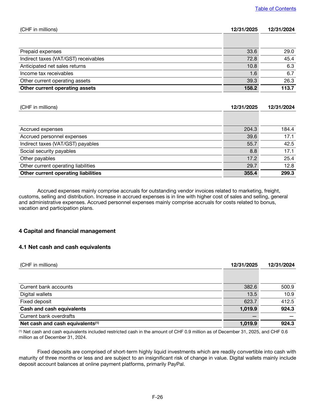 (CHF in millions) 12/31/2025 12/31/2024 Prepaid expenses 33.6 29.0 Indirect taxes (VAT/GST) receivables 72.8 45.4 Anticipated net sales returns 10.8 6.3 Income tax receivables 1.6 6.7 Other current operating assets 39.3 26.3 Other current operating assets 158.2 113.7 (CHF in millions) 12/31/2025 12/31/2024 Accrued expenses 204.3 184.4 Accrued personnel expenses 39.6 17.1 Indirect taxes (VAT/GST) payables 55.7 42.5 Social security payables 8.8 17.1 Other payables 17.2 25.4 Other current operating liabilities 29.7 12.8 Other current operating liabilities 355.4 299.3 Accrued expenses mainly comprise accruals for outstanding vendor invoices related to marketing, freight, customs, selling and distribution. Increase in accrued expenses is in line with higher cost of sales and selling, general and administrative expenses. Accrued personnel expenses mainly comprise accruals for costs related to bonus, vacation and participation plans. 4 Capital and financial management 4.1 Net cash and cash equivalents (CHF in millions) 12/31/2025 12/31/2024 Current bank accounts 382.6 500.9 Digital wallets 13.5 10.9 Fixed deposit 623.7 412.5 Cash and cash equivalents 1,019.9 924.3 Current bank overdrafts — — Net cash and cash equivalents(1) 1,019.9 924.3 (1) Net cash and cash equivalents included restricted cash in the amount of CHF 0.9 million as of December 31, 2025, and CHF 0.6 million as of December 31, 2024. Fixed deposits are comprised of short-term highly liquid investments which are readily convertible into cash with maturity of three months or less and are subject to an insignificant risk of change in value. Digital wallets mainly include deposit account balances at online payment platforms, primarily PayPal. Table of Contents F-26