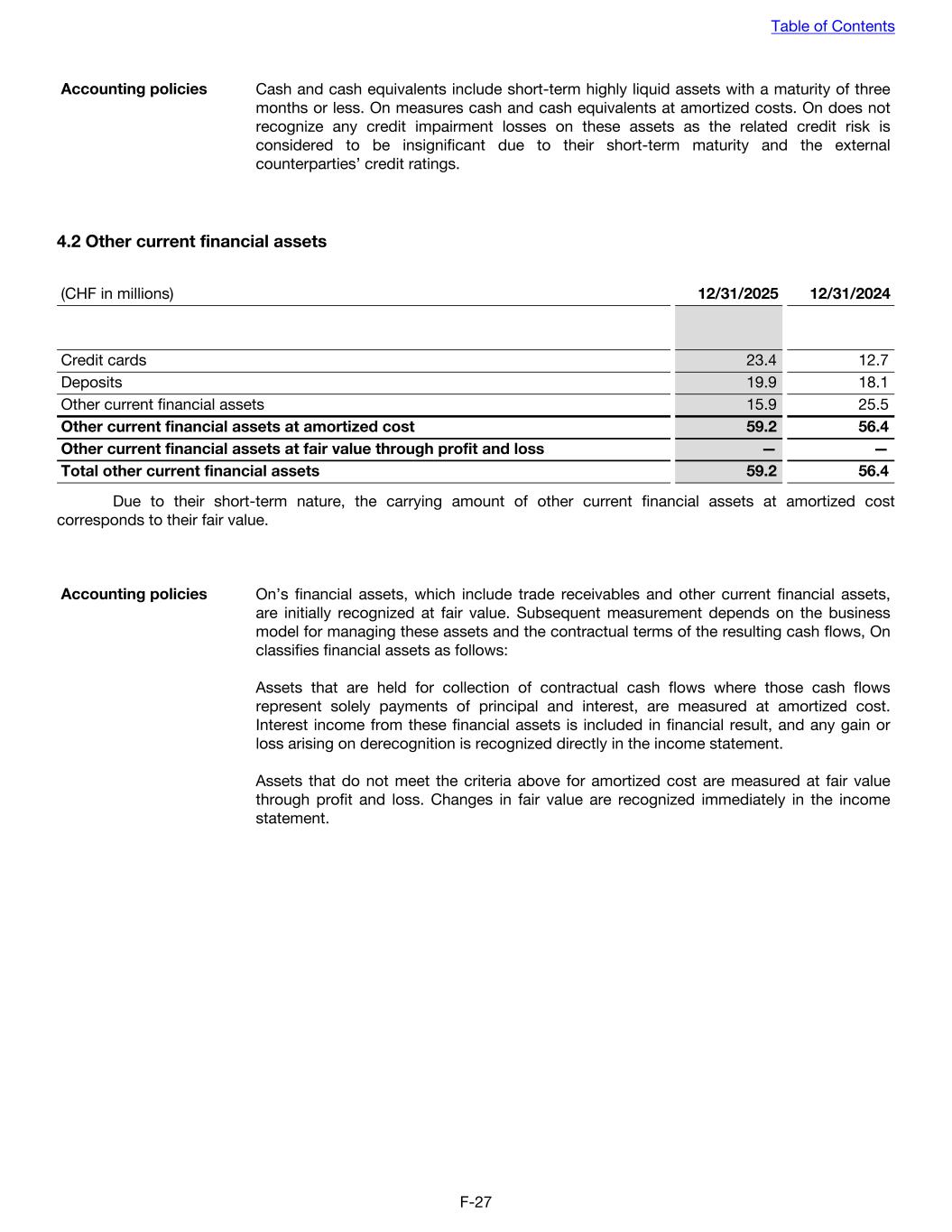 Accounting policies Cash and cash equivalents include short-term highly liquid assets with a maturity of three months or less. On measures cash and cash equivalents at amortized costs. On does not recognize any credit impairment losses on these assets as the related credit risk is considered to be insignificant due to their short-term maturity and the external counterparties’ credit ratings. 4.2 Other current financial assets (CHF in millions) 12/31/2025 12/31/2024 Credit cards 23.4 12.7 Deposits 19.9 18.1 Other current financial assets 15.9 25.5 Other current financial assets at amortized cost 59.2 56.4 Other current financial assets at fair value through profit and loss — — Total other current financial assets 59.2 56.4 Due to their short-term nature, the carrying amount of other current financial assets at amortized cost corresponds to their fair value. Accounting policies On’s financial assets, which include trade receivables and other current financial assets, are initially recognized at fair value. Subsequent measurement depends on the business model for managing these assets and the contractual terms of the resulting cash flows, On classifies financial assets as follows: Assets that are held for collection of contractual cash flows where those cash flows represent solely payments of principal and interest, are measured at amortized cost. Interest income from these financial assets is included in financial result, and any gain or loss arising on derecognition is recognized directly in the income statement. Assets that do not meet the criteria above for amortized cost are measured at fair value through profit and loss. Changes in fair value are recognized immediately in the income statement. Table of Contents F-27