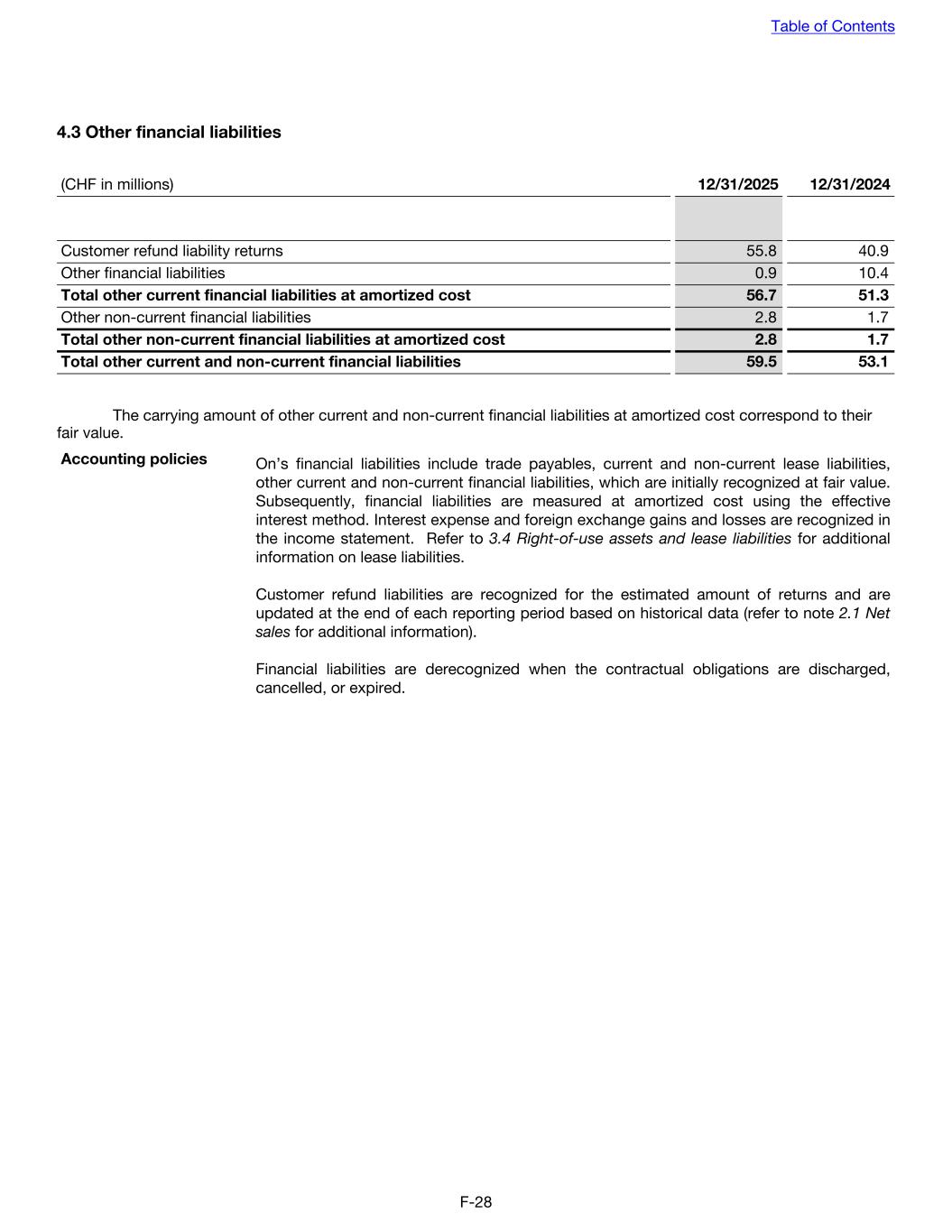 4.3 Other financial liabilities (CHF in millions) 12/31/2025 12/31/2024 Customer refund liability returns 55.8 40.9 Other financial liabilities 0.9 10.4 Total other current financial liabilities at amortized cost 56.7 51.3 Other non-current financial liabilities 2.8 1.7 Total other non-current financial liabilities at amortized cost 2.8 1.7 Total other current and non-current financial liabilities 59.5 53.1 The carrying amount of other current and non-current financial liabilities at amortized cost correspond to their fair value. Accounting policies On’s financial liabilities include trade payables, current and non-current lease liabilities, other current and non-current financial liabilities, which are initially recognized at fair value. Subsequently, financial liabilities are measured at amortized cost using the effective interest method. Interest expense and foreign exchange gains and losses are recognized in the income statement. Refer to 3.4 Right-of-use assets and lease liabilities for additional information on lease liabilities. Customer refund liabilities are recognized for the estimated amount of returns and are updated at the end of each reporting period based on historical data (refer to note 2.1 Net sales for additional information). Financial liabilities are derecognized when the contractual obligations are discharged, cancelled, or expired. Table of Contents F-28