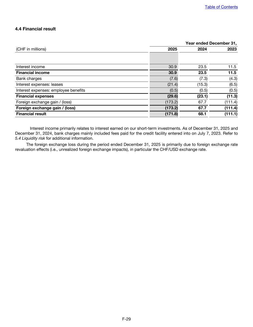 4.4 Financial result Year ended December 31, (CHF in millions) 2025 2024 2023 Interest income 30.9 23.5 11.5 Financial income 30.9 23.5 11.5 Bank charges (7.6) (7.3) (4.3) Interest expenses: leases (21.4) (15.3) (6.5) Interest expenses: employee benefits (0.5) (0.5) (0.5) Financial expenses (29.6) (23.1) (11.3) Foreign exchange gain / (loss) (173.2) 67.7 (111.4) Foreign exchange gain / (loss) (173.2) 67.7 (111.4) Financial result (171.8) 68.1 (111.1) Interest income primarily relates to interest earned on our short-term investments. As of December 31, 2025 and December 31, 2024, bank charges mainly included fees paid for the credit facility entered into on July 7, 2023. Refer to 5.4 Liquidity risk for additional information. The foreign exchange loss during the period ended December 31, 2025 is primarily due to foreign exchange rate revaluation effects (i.e., unrealized foreign exchange impacts), in particular the CHF/USD exchange rate. Table of Contents F-29