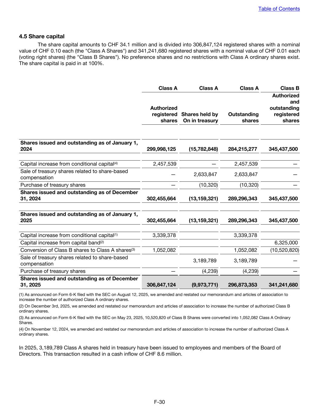 4.5 Share capital The share capital amounts to CHF 34.1 million and is divided into 306,847,124 registered shares with a nominal value of CHF 0.10 each (the "Class A Shares") and 341,241,680 registered shares with a nominal value of CHF 0.01 each (voting right shares) (the "Class B Shares"). No preference shares and no restrictions with Class A ordinary shares exist. The share capital is paid in at 100%. Class A Class A Class A Class B Authorized registered shares Shares held by On in treasury Outstanding shares Authorized and outstanding registered shares Shares issued and outstanding as of January 1, 2024 299,998,125 (15,782,848) 284,215,277 345,437,500 Capital increase from conditional capital(4) 2,457,539 — 2,457,539 — Sale of treasury shares related to share-based compensation — 2,633,847 2,633,847 — Purchase of treasury shares — (10,320) (10,320) — Shares issued and outstanding as of December 31, 2024 302,455,664 (13,159,321) 289,296,343 345,437,500 Shares issued and outstanding as of January 1, 2025 302,455,664 (13,159,321) 289,296,343 345,437,500 Capital increase from conditional capital(1) 3,339,378 3,339,378 Capital increase from capital band(2) 6,325,000 Conversion of Class B shares to Class A shares(3) 1,052,082 1,052,082 (10,520,820) Sale of treasury shares related to share-based compensation 3,189,789 3,189,789 — Purchase of treasury shares — (4,239) (4,239) — Shares issued and outstanding as of December 31, 2025 306,847,124 (9,973,771) 296,873,353 341,241,680 (1) As announced on Form 6-K filed with the SEC on August 12, 2025, we amended and restated our memorandum and articles of association to increase the number of authorized Class A ordinary shares. (2) On December 3rd, 2025, we amended and restated our memorandum and articles of association to increase the number of authorized Class B ordinary shares. (3) As announced on Form 6-K filed with the SEC on May 23, 2025, 10,520,820 of Class B Shares were converted into 1,052,082 Class A Ordinary Shares. (4) On November 12, 2024, we amended and restated our memorandum and articles of association to increase the number of authorized Class A ordinary shares. In 2025, 3,189,789 Class A shares held in treasury have been issued to employees and members of the Board of Directors. This transaction resulted in a cash inflow of CHF 8.6 million. Table of Contents F-30