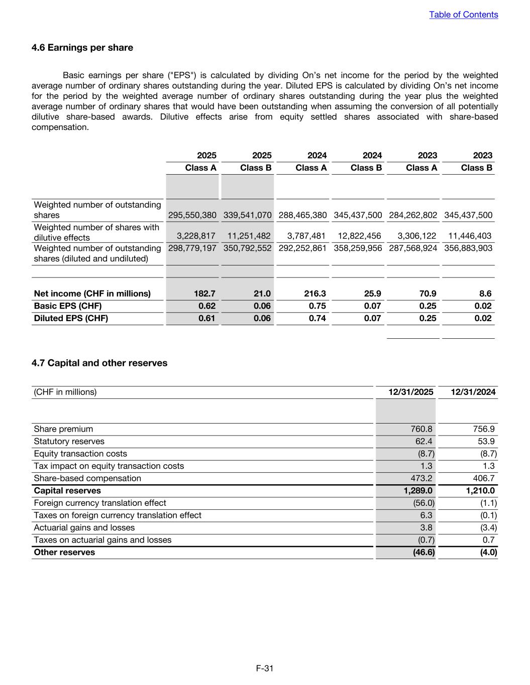 4.6 Earnings per share Basic earnings per share ("EPS") is calculated by dividing On’s net income for the period by the weighted average number of ordinary shares outstanding during the year. Diluted EPS is calculated by dividing On’s net income for the period by the weighted average number of ordinary shares outstanding during the year plus the weighted average number of ordinary shares that would have been outstanding when assuming the conversion of all potentially dilutive share-based awards. Dilutive effects arise from equity settled shares associated with share-based compensation. 2025 2025 2024 2024 2023 2023 Class A Class B Class A Class B Class A Class B Weighted number of outstanding shares 295,550,380 339,541,070 288,465,380 345,437,500 284,262,802 345,437,500 Weighted number of shares with dilutive effects 3,228,817 11,251,482 3,787,481 12,822,456 3,306,122 11,446,403 Weighted number of outstanding shares (diluted and undiluted) 298,779,197 350,792,552 292,252,861 358,259,956 287,568,924 356,883,903 Net income (CHF in millions) 182.7 21.0 216.3 25.9 70.9 8.6 Basic EPS (CHF) 0.62 0.06 0.75 0.07 0.25 0.02 Diluted EPS (CHF) 0.61 0.06 0.74 0.07 0.25 0.02 4.7 Capital and other reserves (CHF in millions) 12/31/2025 12/31/2024 Share premium 760.8 756.9 Statutory reserves 62.4 53.9 Equity transaction costs (8.7) (8.7) Tax impact on equity transaction costs 1.3 1.3 Share-based compensation 473.2 406.7 Capital reserves 1,289.0 1,210.0 Foreign currency translation effect (56.0) (1.1) Taxes on foreign currency translation effect 6.3 (0.1) Actuarial gains and losses 3.8 (3.4) Taxes on actuarial gains and losses (0.7) 0.7 Other reserves (46.6) (4.0) Table of Contents F-31
