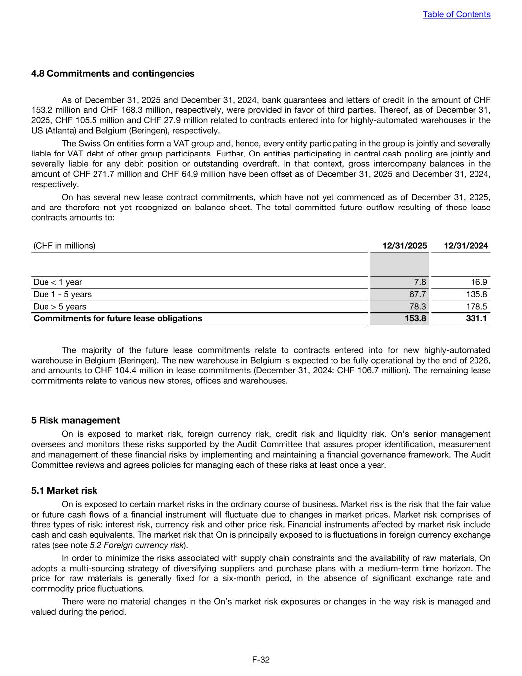 4.8 Commitments and contingencies As of December 31, 2025 and December 31, 2024, bank guarantees and letters of credit in the amount of CHF 153.2 million and CHF 168.3 million, respectively, were provided in favor of third parties. Thereof, as of December 31, 2025, CHF 105.5 million and CHF 27.9 million related to contracts entered into for highly-automated warehouses in the US (Atlanta) and Belgium (Beringen), respectively. The Swiss On entities form a VAT group and, hence, every entity participating in the group is jointly and severally liable for VAT debt of other group participants. Further, On entities participating in central cash pooling are jointly and severally liable for any debit position or outstanding overdraft. In that context, gross intercompany balances in the amount of CHF 271.7 million and CHF 64.9 million have been offset as of December 31, 2025 and December 31, 2024, respectively. On has several new lease contract commitments, which have not yet commenced as of December 31, 2025, and are therefore not yet recognized on balance sheet. The total committed future outflow resulting of these lease contracts amounts to: (CHF in millions) 12/31/2025 12/31/2024 Due < 1 year 7.8 16.9 Due 1 - 5 years 67.7 135.8 Due > 5 years 78.3 178.5 Commitments for future lease obligations 153.8 331.1 The majority of the future lease commitments relate to contracts entered into for new highly-automated warehouse in Belgium (Beringen). The new warehouse in Belgium is expected to be fully operational by the end of 2026, and amounts to CHF 104.4 million in lease commitments (December 31, 2024: CHF 106.7 million). The remaining lease commitments relate to various new stores, offices and warehouses. 5 Risk management On is exposed to market risk, foreign currency risk, credit risk and liquidity risk. On’s senior management oversees and monitors these risks supported by the Audit Committee that assures proper identification, measurement and management of these financial risks by implementing and maintaining a financial governance framework. The Audit Committee reviews and agrees policies for managing each of these risks at least once a year. 5.1 Market risk On is exposed to certain market risks in the ordinary course of business. Market risk is the risk that the fair value or future cash flows of a financial instrument will fluctuate due to changes in market prices. Market risk comprises of three types of risk: interest risk, currency risk and other price risk. Financial instruments affected by market risk include cash and cash equivalents. The market risk that On is principally exposed to is fluctuations in foreign currency exchange rates (see note 5.2 Foreign currency risk). In order to minimize the risks associated with supply chain constraints and the availability of raw materials, On adopts a multi-sourcing strategy of diversifying suppliers and purchase plans with a medium-term time horizon. The price for raw materials is generally fixed for a six-month period, in the absence of significant exchange rate and commodity price fluctuations. There were no material changes in the On’s market risk exposures or changes in the way risk is managed and valued during the period. Table of Contents F-32