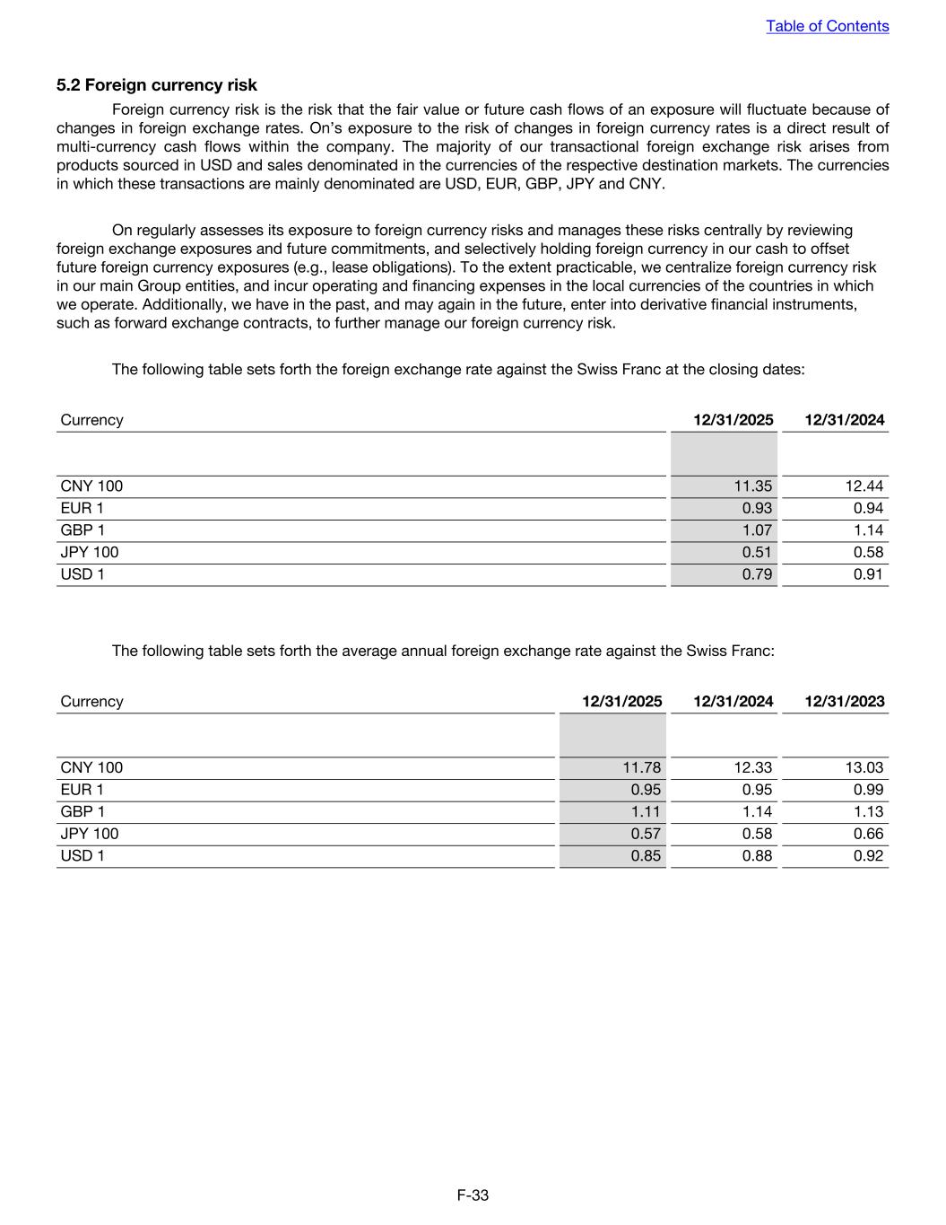 5.2 Foreign currency risk Foreign currency risk is the risk that the fair value or future cash flows of an exposure will fluctuate because of changes in foreign exchange rates. On’s exposure to the risk of changes in foreign currency rates is a direct result of multi-currency cash flows within the company. The majority of our transactional foreign exchange risk arises from products sourced in USD and sales denominated in the currencies of the respective destination markets. The currencies in which these transactions are mainly denominated are USD, EUR, GBP, JPY and CNY. On regularly assesses its exposure to foreign currency risks and manages these risks centrally by reviewing foreign exchange exposures and future commitments, and selectively holding foreign currency in our cash to offset future foreign currency exposures (e.g., lease obligations). To the extent practicable, we centralize foreign currency risk in our main Group entities, and incur operating and financing expenses in the local currencies of the countries in which we operate. Additionally, we have in the past, and may again in the future, enter into derivative financial instruments, such as forward exchange contracts, to further manage our foreign currency risk. The following table sets forth the foreign exchange rate against the Swiss Franc at the closing dates: Currency 12/31/2025 12/31/2024 CNY 100 11.35 12.44 EUR 1 0.93 0.94 GBP 1 1.07 1.14 JPY 100 0.51 0.58 USD 1 0.79 0.91 The following table sets forth the average annual foreign exchange rate against the Swiss Franc: Currency 12/31/2025 12/31/2024 12/31/2023 CNY 100 11.78 12.33 13.03 EUR 1 0.95 0.95 0.99 GBP 1 1.11 1.14 1.13 JPY 100 0.57 0.58 0.66 USD 1 0.85 0.88 0.92 Table of Contents F-33