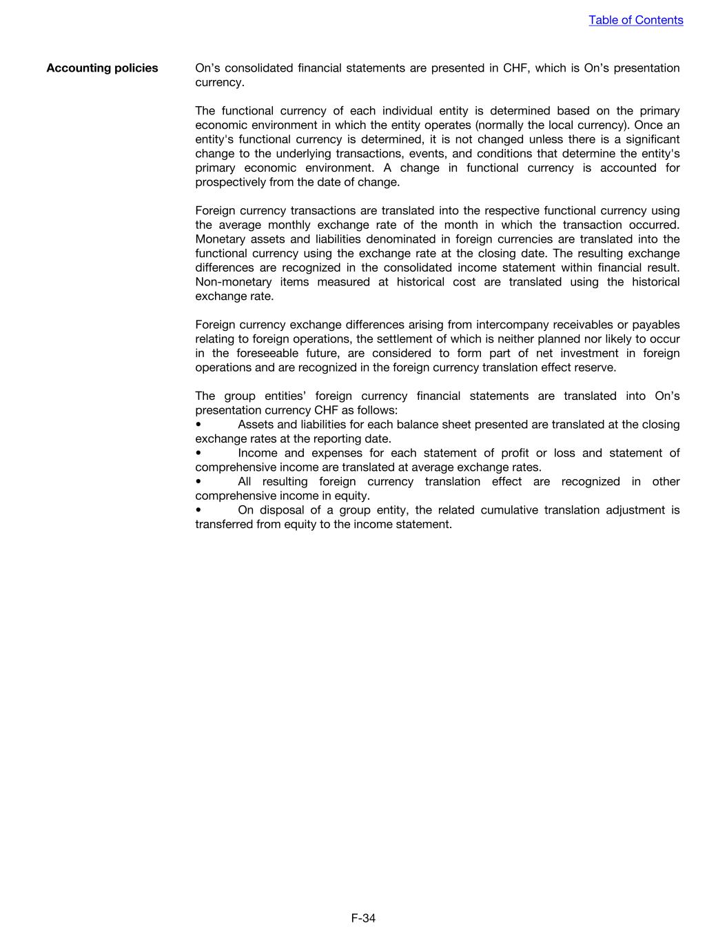 Accounting policies On’s consolidated financial statements are presented in CHF, which is On’s presentation currency. The functional currency of each individual entity is determined based on the primary economic environment in which the entity operates (normally the local currency). Once an entity's functional currency is determined, it is not changed unless there is a significant change to the underlying transactions, events, and conditions that determine the entity's primary economic environment. A change in functional currency is accounted for prospectively from the date of change. Foreign currency transactions are translated into the respective functional currency using the average monthly exchange rate of the month in which the transaction occurred. Monetary assets and liabilities denominated in foreign currencies are translated into the functional currency using the exchange rate at the closing date. The resulting exchange differences are recognized in the consolidated income statement within financial result. Non-monetary items measured at historical cost are translated using the historical exchange rate. Foreign currency exchange differences arising from intercompany receivables or payables relating to foreign operations, the settlement of which is neither planned nor likely to occur in the foreseeable future, are considered to form part of net investment in foreign operations and are recognized in the foreign currency translation effect reserve. The group entities’ foreign currency financial statements are translated into On’s presentation currency CHF as follows: • Assets and liabilities for each balance sheet presented are translated at the closing exchange rates at the reporting date. • Income and expenses for each statement of profit or loss and statement of comprehensive income are translated at average exchange rates. • All resulting foreign currency translation effect are recognized in other comprehensive income in equity. • On disposal of a group entity, the related cumulative translation adjustment is transferred from equity to the income statement. Table of Contents F-34
