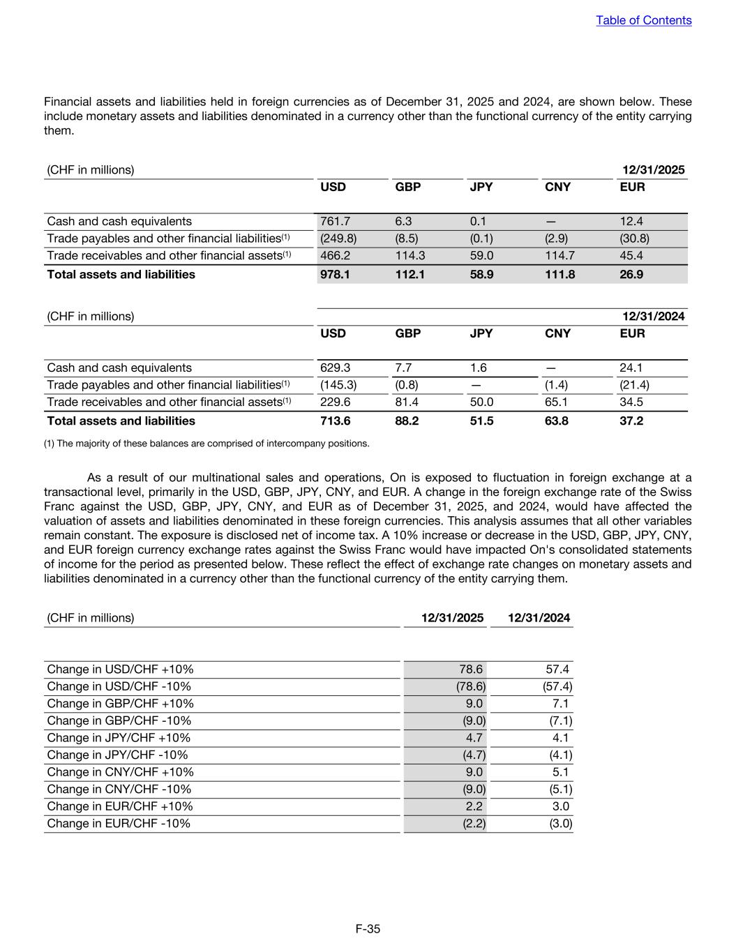 Financial assets and liabilities held in foreign currencies as of December 31, 2025 and 2024, are shown below. These include monetary assets and liabilities denominated in a currency other than the functional currency of the entity carrying them. (CHF in millions) 12/31/2025 USD GBP JPY CNY EUR Cash and cash equivalents 761.7 6.3 0.1 — 12.4 Trade payables and other financial liabilities(1) (249.8) (8.5) (0.1) (2.9) (30.8) Trade receivables and other financial assets(1) 466.2 114.3 59.0 114.7 45.4 Total assets and liabilities 978.1 112.1 58.9 111.8 26.9 (CHF in millions) 12/31/2024 USD GBP JPY CNY EUR Cash and cash equivalents 629.3 7.7 1.6 — 24.1 Trade payables and other financial liabilities(1) (145.3) (0.8) — (1.4) (21.4) Trade receivables and other financial assets(1) 229.6 81.4 50.0 65.1 34.5 Total assets and liabilities 713.6 88.2 51.5 63.8 37.2 (1) The majority of these balances are comprised of intercompany positions. As a result of our multinational sales and operations, On is exposed to fluctuation in foreign exchange at a transactional level, primarily in the USD, GBP, JPY, CNY, and EUR. A change in the foreign exchange rate of the Swiss Franc against the USD, GBP, JPY, CNY, and EUR as of December 31, 2025, and 2024, would have affected the valuation of assets and liabilities denominated in these foreign currencies. This analysis assumes that all other variables remain constant. The exposure is disclosed net of income tax. A 10% increase or decrease in the USD, GBP, JPY, CNY, and EUR foreign currency exchange rates against the Swiss Franc would have impacted On's consolidated statements of income for the period as presented below. These reflect the effect of exchange rate changes on monetary assets and liabilities denominated in a currency other than the functional currency of the entity carrying them. (CHF in millions) 12/31/2025 12/31/2024 Change in USD/CHF +10% 78.6 57.4 Change in USD/CHF -10% (78.6) (57.4) Change in GBP/CHF +10% 9.0 7.1 Change in GBP/CHF -10% (9.0) (7.1) Change in JPY/CHF +10% 4.7 4.1 Change in JPY/CHF -10% (4.7) (4.1) Change in CNY/CHF +10% 9.0 5.1 Change in CNY/CHF -10% (9.0) (5.1) Change in EUR/CHF +10% 2.2 3.0 Change in EUR/CHF -10% (2.2) (3.0) Table of Contents F-35