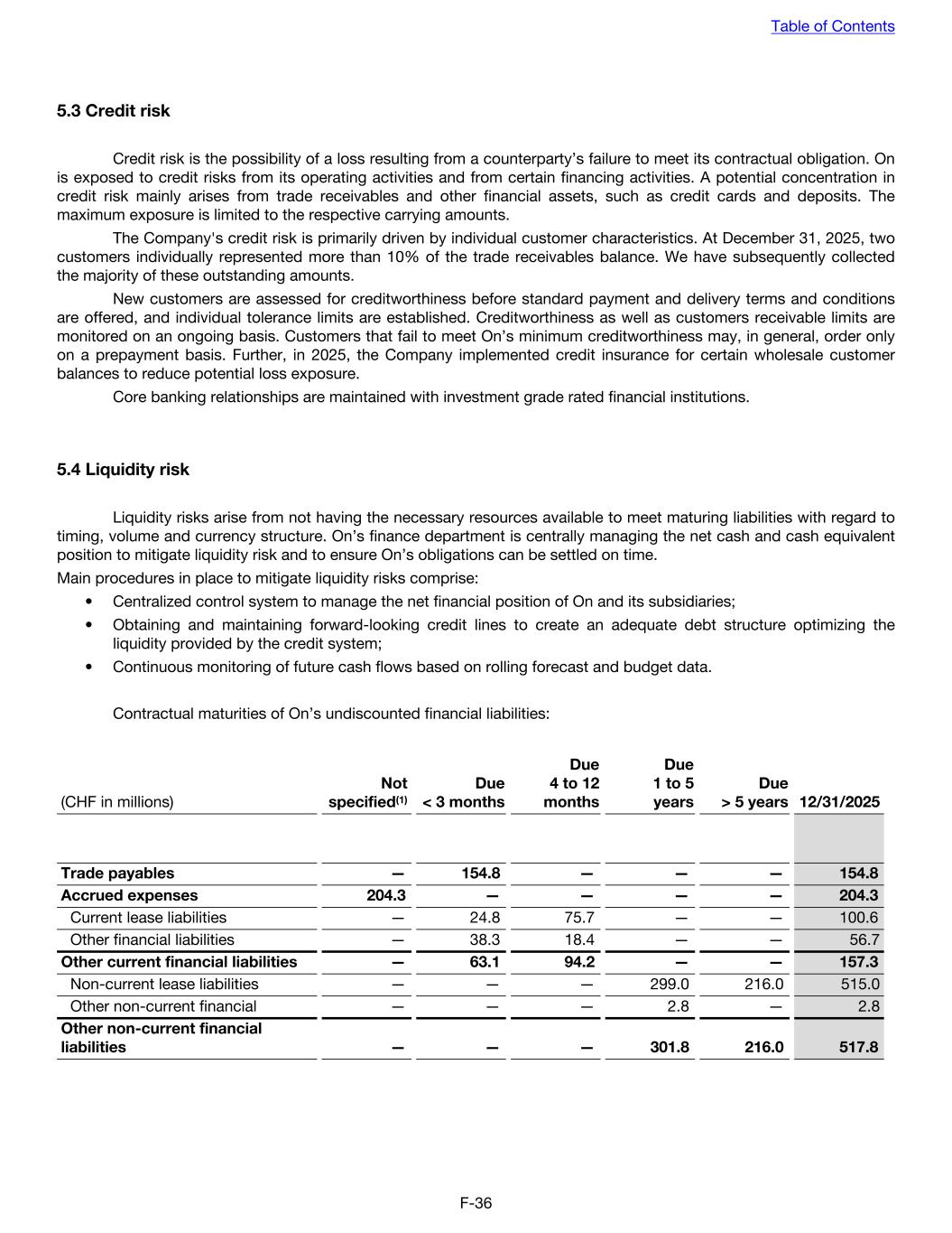 5.3 Credit risk Credit risk is the possibility of a loss resulting from a counterparty’s failure to meet its contractual obligation. On is exposed to credit risks from its operating activities and from certain financing activities. A potential concentration in credit risk mainly arises from trade receivables and other financial assets, such as credit cards and deposits. The maximum exposure is limited to the respective carrying amounts. The Company's credit risk is primarily driven by individual customer characteristics. At December 31, 2025, two customers individually represented more than 10% of the trade receivables balance. We have subsequently collected the majority of these outstanding amounts. New customers are assessed for creditworthiness before standard payment and delivery terms and conditions are offered, and individual tolerance limits are established. Creditworthiness as well as customers receivable limits are monitored on an ongoing basis. Customers that fail to meet On’s minimum creditworthiness may, in general, order only on a prepayment basis. Further, in 2025, the Company implemented credit insurance for certain wholesale customer balances to reduce potential loss exposure. Core banking relationships are maintained with investment grade rated financial institutions. 5.4 Liquidity risk Liquidity risks arise from not having the necessary resources available to meet maturing liabilities with regard to timing, volume and currency structure. On’s finance department is centrally managing the net cash and cash equivalent position to mitigate liquidity risk and to ensure On’s obligations can be settled on time. Main procedures in place to mitigate liquidity risks comprise: • Centralized control system to manage the net financial position of On and its subsidiaries; • Obtaining and maintaining forward-looking credit lines to create an adequate debt structure optimizing the liquidity provided by the credit system; • Continuous monitoring of future cash flows based on rolling forecast and budget data. Contractual maturities of On’s undiscounted financial liabilities: (CHF in millions) Not specified(1) Due < 3 months Due 4 to 12 months Due 1 to 5 years Due > 5 years 12/31/2025 Trade payables — 154.8 — — — 154.8 Accrued expenses 204.3 — — — — 204.3 Current lease liabilities — 24.8 75.7 — — 100.6 Other financial liabilities — 38.3 18.4 — — 56.7 Other current financial liabilities — 63.1 94.2 — — 157.3 Non-current lease liabilities — — — 299.0 216.0 515.0 Other non-current financial — — — 2.8 — 2.8 Other non-current financial liabilities — — — 301.8 216.0 517.8 Table of Contents F-36