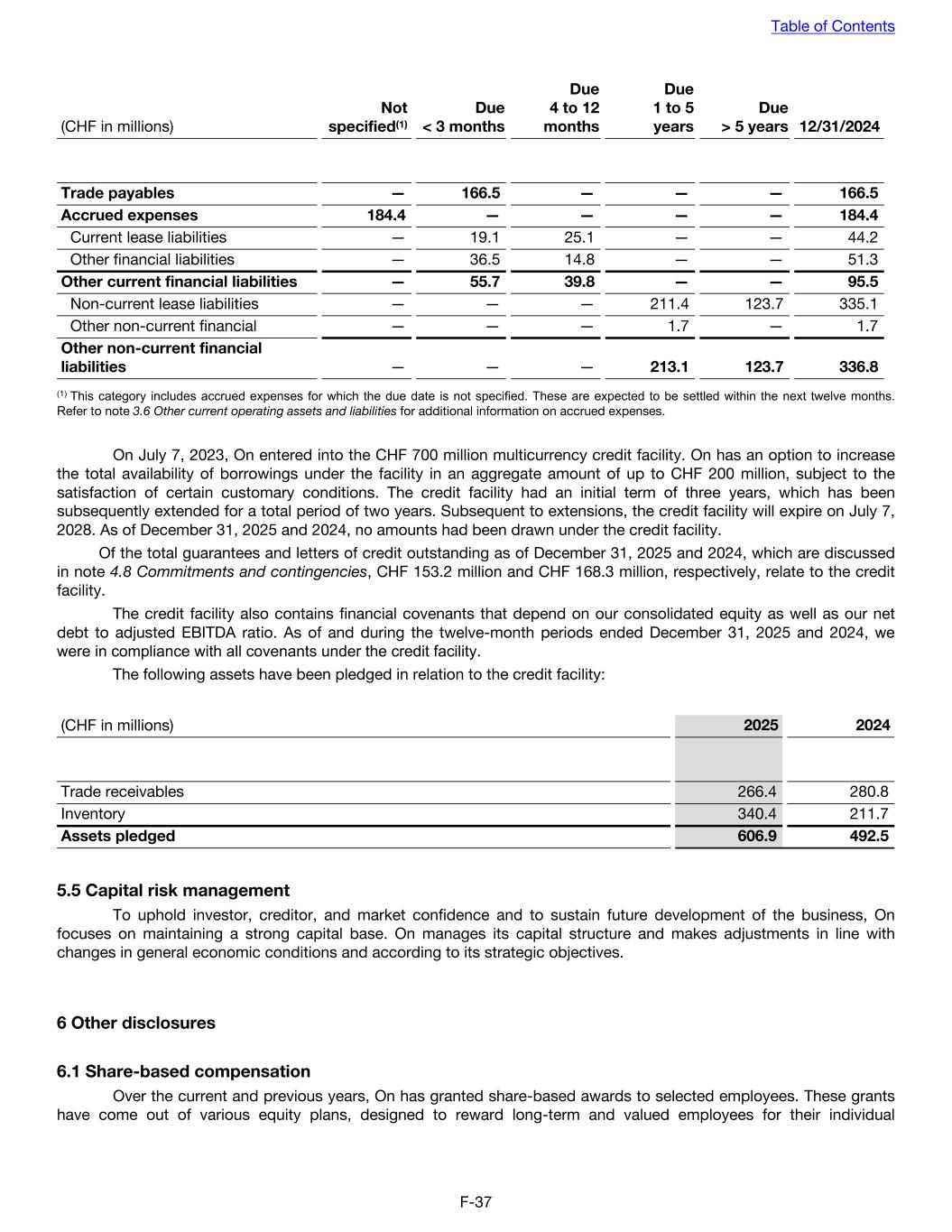 (CHF in millions) Not specified(1) Due < 3 months Due 4 to 12 months Due 1 to 5 years Due > 5 years 12/31/2024 Trade payables — 166.5 — — — 166.5 Accrued expenses 184.4 — — — — 184.4 Current lease liabilities — 19.1 25.1 — — 44.2 Other financial liabilities — 36.5 14.8 — — 51.3 Other current financial liabilities — 55.7 39.8 — — 95.5 Non-current lease liabilities — — — 211.4 123.7 335.1 Other non-current financial — — — 1.7 — 1.7 Other non-current financial liabilities — — — 213.1 123.7 336.8 (1) This category includes accrued expenses for which the due date is not specified. These are expected to be settled within the next twelve months. Refer to note 3.6 Other current operating assets and liabilities for additional information on accrued expenses. On July 7, 2023, On entered into the CHF 700 million multicurrency credit facility. On has an option to increase the total availability of borrowings under the facility in an aggregate amount of up to CHF 200 million, subject to the satisfaction of certain customary conditions. The credit facility had an initial term of three years, which has been subsequently extended for a total period of two years. Subsequent to extensions, the credit facility will expire on July 7, 2028. As of December 31, 2025 and 2024, no amounts had been drawn under the credit facility. Of the total guarantees and letters of credit outstanding as of December 31, 2025 and 2024, which are discussed in note 4.8 Commitments and contingencies, CHF 153.2 million and CHF 168.3 million, respectively, relate to the credit facility. The credit facility also contains financial covenants that depend on our consolidated equity as well as our net debt to adjusted EBITDA ratio. As of and during the twelve-month periods ended December 31, 2025 and 2024, we were in compliance with all covenants under the credit facility. The following assets have been pledged in relation to the credit facility: (CHF in millions) 2025 2024 Trade receivables 266.4 280.8 Inventory 340.4 211.7 Assets pledged 606.9 492.5 5.5 Capital risk management To uphold investor, creditor, and market confidence and to sustain future development of the business, On focuses on maintaining a strong capital base. On manages its capital structure and makes adjustments in line with changes in general economic conditions and according to its strategic objectives. 6 Other disclosures 6.1 Share-based compensation Over the current and previous years, On has granted share-based awards to selected employees. These grants have come out of various equity plans, designed to reward long-term and valued employees for their individual Table of Contents F-37