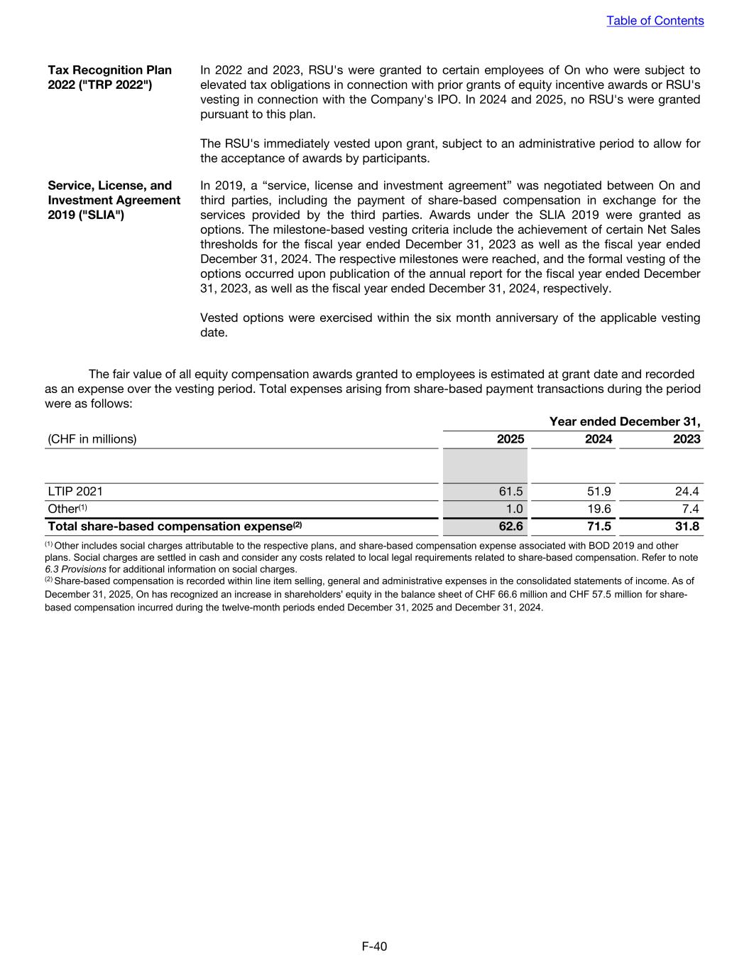 Tax Recognition Plan 2022 ("TRP 2022") In 2022 and 2023, RSU's were granted to certain employees of On who were subject to elevated tax obligations in connection with prior grants of equity incentive awards or RSU's vesting in connection with the Company's IPO. In 2024 and 2025, no RSU's were granted pursuant to this plan. The RSU's immediately vested upon grant, subject to an administrative period to allow for the acceptance of awards by participants. Service, License, and Investment Agreement 2019 ("SLIA") In 2019, a “service, license and investment agreement” was negotiated between On and third parties, including the payment of share-based compensation in exchange for the services provided by the third parties. Awards under the SLIA 2019 were granted as options. The milestone-based vesting criteria include the achievement of certain Net Sales thresholds for the fiscal year ended December 31, 2023 as well as the fiscal year ended December 31, 2024. The respective milestones were reached, and the formal vesting of the options occurred upon publication of the annual report for the fiscal year ended December 31, 2023, as well as the fiscal year ended December 31, 2024, respectively. Vested options were exercised within the six month anniversary of the applicable vesting date. The fair value of all equity compensation awards granted to employees is estimated at grant date and recorded as an expense over the vesting period. Total expenses arising from share-based payment transactions during the period were as follows: Year ended December 31, (CHF in millions) 2025 2024 2023 LTIP 2021 61.5 51.9 24.4 Other(1) 1.0 19.6 7.4 Total share-based compensation expense(2) 62.6 71.5 31.8 (1) Other includes social charges attributable to the respective plans, and share-based compensation expense associated with BOD 2019 and other plans. Social charges are settled in cash and consider any costs related to local legal requirements related to share-based compensation. Refer to note 6.3 Provisions for additional information on social charges. (2) Share-based compensation is recorded within line item selling, general and administrative expenses in the consolidated statements of income. As of December 31, 2025, On has recognized an increase in shareholders' equity in the balance sheet of CHF 66.6 million and CHF 57.5 million for share- based compensation incurred during the twelve-month periods ended December 31, 2025 and December 31, 2024. Table of Contents F-40