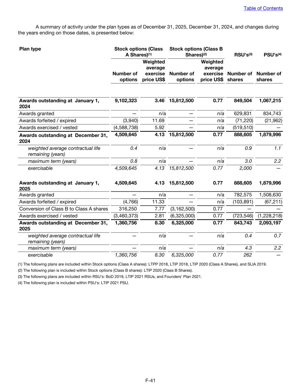 A summary of activity under the plan types as of December 31, 2025, December 31, 2024, and changes during the years ending on those dates, is presented below: Plan type Stock options (Class A Shares)(1) Stock options (Class B Shares)(2) RSU's(3) PSU's(4) Number of options Weighted average exercise price US$ Number of options Weighted average exercise price US$ Number of shares Number of shares Awards outstanding at January 1, 2024 9,102,323 3.46 15,812,500 0.77 849,504 1,067,215 Awards granted — n/a — n/a 629,831 834,743 Awards forfeited / expired (3,940) 11.69 — n/a (71,220) (21,962) Awards exercised / vested (4,588,738) 5.92 — n/a (519,510) — Awards outstanding at December 31, 2024 4,509,645 4.13 15,812,500 0.77 888,605 1,879,996 weighted average contractual life remaining (years) 0.4 n/a — n/a 0.9 1.1 maximum term (years) 0.8 n/a — n/a 3.0 2.2 exercisable 4,509,645 4.13 15,812,500 0.77 2,000 — Awards outstanding at January 1, 2025 4,509,645 4.13 15,812,500 0.77 888,605 1,879,996 Awards granted — n/a — n/a 782,575 1,508,630 Awards forfeited / expired (4,766) 11.33 — n/a (103,891) (67,211) Conversion of Class B to Class A shares 316,250 7.77 (3,162,500) 0.77 — — Awards exercised / vested (3,460,373) 2.81 (6,325,000) 0.77 (723,546) (1,228,218) Awards outstanding at December 31, 2025 1,360,756 8.30 6,325,000 0.77 843,743 2,093,197 weighted average contractual life remaining (years) — n/a — n/a 0.4 0.7 maximum term (years) — n/a — n/a 4.3 2.2 exercisable 1,360,756 8.30 6,325,000 0.77 262 — (1) The following plans are included within Stock options (Class A shares): LTPP 2018, LTIP 2018, LTIP 2020 (Class A Shares), and SLIA 2019. (2) The following plan is included within Stock options (Class B shares): LTIP 2020 (Class B Shares). (3) The following plans are included within RSU's: BoD 2019, LTIP 2021 RSUs, and Founders' Plan 2021. (4) The following plan is included within PSU's: LTIP 2021 PSU. Table of Contents F-41