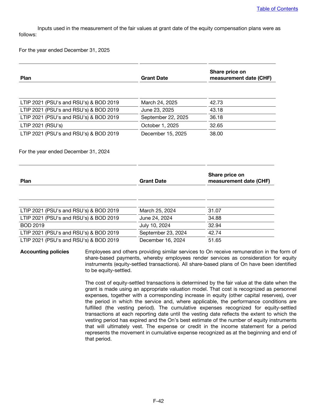 Inputs used in the measurement of the fair values at grant date of the equity compensation plans were as follows: For the year ended December 31, 2025 Plan Grant Date Share price on measurement date (CHF) LTIP 2021 (PSU's and RSU's) & BOD 2019 March 24, 2025 42.73 LTIP 2021 (PSU's and RSU's) & BOD 2019 June 23, 2025 43.18 LTIP 2021 (PSU's and RSU's) & BOD 2019 September 22, 2025 36.18 LTIP 2021 (RSU's) October 1, 2025 32.65 LTIP 2021 (PSU's and RSU's) & BOD 2019 December 15, 2025 38.00 For the year ended December 31, 2024 Plan Grant Date Share price on measurement date (CHF) LTIP 2021 (PSU's and RSU's) & BOD 2019 March 25, 2024 31.07 LTIP 2021 (PSU's and RSU's) & BOD 2019 June 24, 2024 34.88 BOD 2019 July 10, 2024 32.94 LTIP 2021 (PSU's and RSU's) & BOD 2019 September 23, 2024 42.74 LTIP 2021 (PSU's and RSU's) & BOD 2019 December 16, 2024 51.65 Accounting policies Employees and others providing similar services to On receive remuneration in the form of share-based payments, whereby employees render services as consideration for equity instruments (equity-settled transactions). All share-based plans of On have been identified to be equity-settled. The cost of equity-settled transactions is determined by the fair value at the date when the grant is made using an appropriate valuation model. That cost is recognized as personnel expenses, together with a corresponding increase in equity (other capital reserves), over the period in which the service and, where applicable, the performance conditions are fulfilled (the vesting period). The cumulative expenses recognized for equity-settled transactions at each reporting date until the vesting date reflects the extent to which the vesting period has expired and the On’s best estimate of the number of equity instruments that will ultimately vest. The expense or credit in the income statement for a period represents the movement in cumulative expense recognized as at the beginning and end of that period. Table of Contents F-42