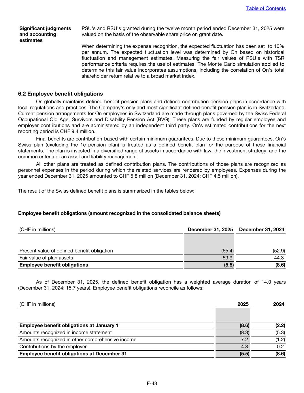 Significant judgments and accounting estimates PSU's and RSU's granted during the twelve month period ended December 31, 2025 were valued on the basis of the observable share price on grant date. When determining the expense recognition, the expected fluctuation has been set to 10% per annum. The expected fluctuation level was determined by On based on historical fluctuation and management estimates. Measuring the fair values of PSU's with TSR performance criteria requires the use of estimates. The Monte Carlo simulation applied to determine this fair value incorporates assumptions, including the correlation of On's total shareholder return relative to a broad market index. 6.2 Employee benefit obligations On globally maintains defined benefit pension plans and defined contribution pension plans in accordance with local regulations and practices. The Company’s only and most significant defined benefit pension plan is in Switzerland. Current pension arrangements for On employees in Switzerland are made through plans governed by the Swiss Federal Occupational Old Age, Survivors and Disability Pension Act (BVG). These plans are funded by regular employee and employer contributions and are administered by an independent third party. On's estimated contributions for the next reporting period is CHF 9.4 million. Final benefits are contribution-based with certain minimum guarantees. Due to these minimum guarantees, On’s Swiss plan (excluding the 1e pension plan) is treated as a defined benefit plan for the purpose of these financial statements. The plan is invested in a diversified range of assets in accordance with law, the investment strategy, and the common criteria of an asset and liability management. All other plans are treated as defined contribution plans. The contributions of those plans are recognized as personnel expenses in the period during which the related services are rendered by employees. Expenses during the year ended December 31, 2025 amounted to CHF 5.8 million (December 31, 2024: CHF 4.5 million). The result of the Swiss defined benefit plans is summarized in the tables below: Employee benefit obligations (amount recognized in the consolidated balance sheets) (CHF in millions) December 31, 2025 December 31, 2024 Present value of defined benefit obligation (65.4) (52.9) Fair value of plan assets 59.9 44.3 Employee benefit obligations (5.5) (8.6) As of December 31, 2025, the defined benefit obligation has a weighted average duration of 14.0 years (December 31, 2024: 15.7 years). Employee benefit obligations reconcile as follows: (CHF in millions) 2025 2024 Employee benefit obligations at January 1 (8.6) (2.2) Amounts recognized in income statement (8.3) (5.3) Amounts recognized in other comprehensive income 7.2 (1.2) Contributions by the employer 4.3 0.2 Employee benefit obligations at December 31 (5.5) (8.6) Table of Contents F-43