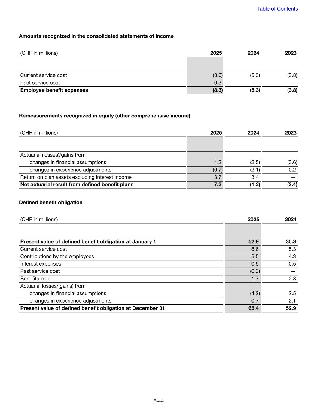 Amounts recognized in the consolidated statements of income (CHF in millions) 2025 2024 2023 Current service cost (8.6) (5.3) (3.8) Past service cost 0.3 — — Employee benefit expenses (8.3) (5.3) (3.8) Remeasurements recognized in equity (other comprehensive income) (CHF in millions) 2025 2024 2023 Actuarial (losses)/gains from changes in financial assumptions 4.2 (2.5) (3.6) changes in experience adjustments (0.7) (2.1) 0.2 Return on plan assets excluding interest income 3.7 3.4 — Net actuarial result from defined benefit plans 7.2 (1.2) (3.4) Defined benefit obligation (CHF in millions) 2025 2024 Present value of defined benefit obligation at January 1 52.9 35.3 Current service cost 8.6 5.3 Contributions by the employees 5.5 4.3 Interest expenses 0.5 0.5 Past service cost (0.3) — Benefits paid 1.7 2.8 Actuarial losses/(gains) from changes in financial assumptions (4.2) 2.5 changes in experience adjustments 0.7 2.1 Present value of defined benefit obligation at December 31 65.4 52.9 Table of Contents F-44