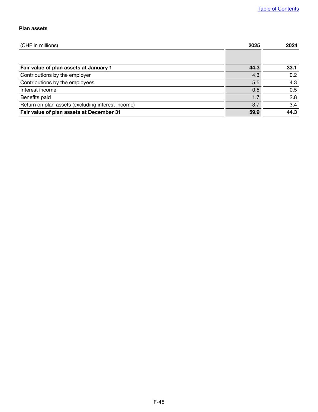 Plan assets (CHF in millions) 2025 2024 Fair value of plan assets at January 1 44.3 33.1 Contributions by the employer 4.3 0.2 Contributions by the employees 5.5 4.3 Interest income 0.5 0.5 Benefits paid 1.7 2.8 Return on plan assets (excluding interest income) 3.7 3.4 Fair value of plan assets at December 31 59.9 44.3 Table of Contents F-45