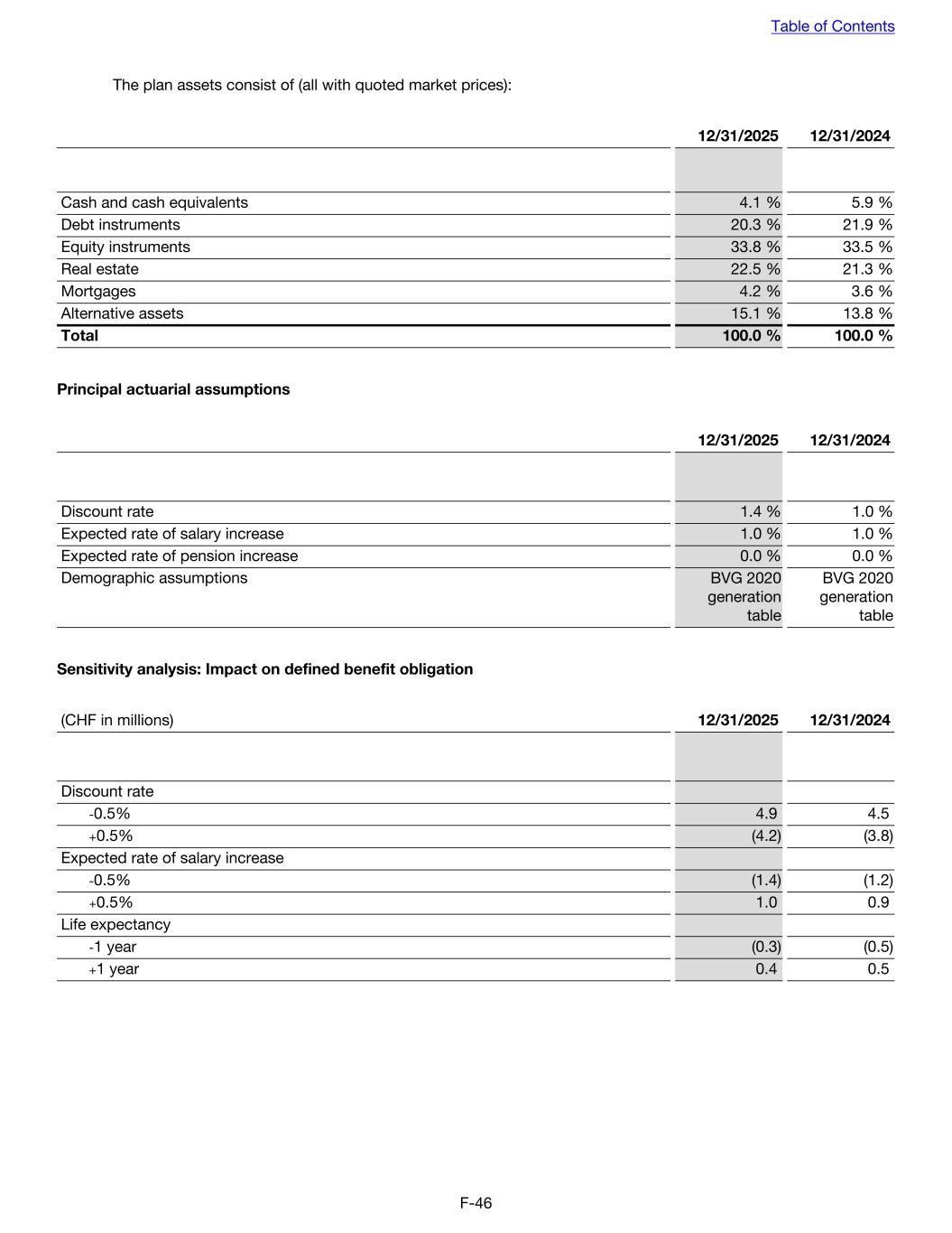 The plan assets consist of (all with quoted market prices): 12/31/2025 12/31/2024 Cash and cash equivalents 4.1 % 5.9 % Debt instruments 20.3 % 21.9 % Equity instruments 33.8 % 33.5 % Real estate 22.5 % 21.3 % Mortgages 4.2 % 3.6 % Alternative assets 15.1 % 13.8 % Total 100.0 % 100.0 % Principal actuarial assumptions 12/31/2025 12/31/2024 Discount rate 1.4 % 1.0 % Expected rate of salary increase 1.0 % 1.0 % Expected rate of pension increase 0.0 % 0.0 % Demographic assumptions BVG 2020 generation table BVG 2020 generation table Sensitivity analysis: Impact on defined benefit obligation (CHF in millions) 12/31/2025 12/31/2024 Discount rate -0.5% 4.9 4.5 +0.5% (4.2) (3.8) Expected rate of salary increase -0.5% (1.4) (1.2) +0.5% 1.0 0.9 Life expectancy -1 year (0.3) (0.5) +1 year 0.4 0.5 Table of Contents F-46