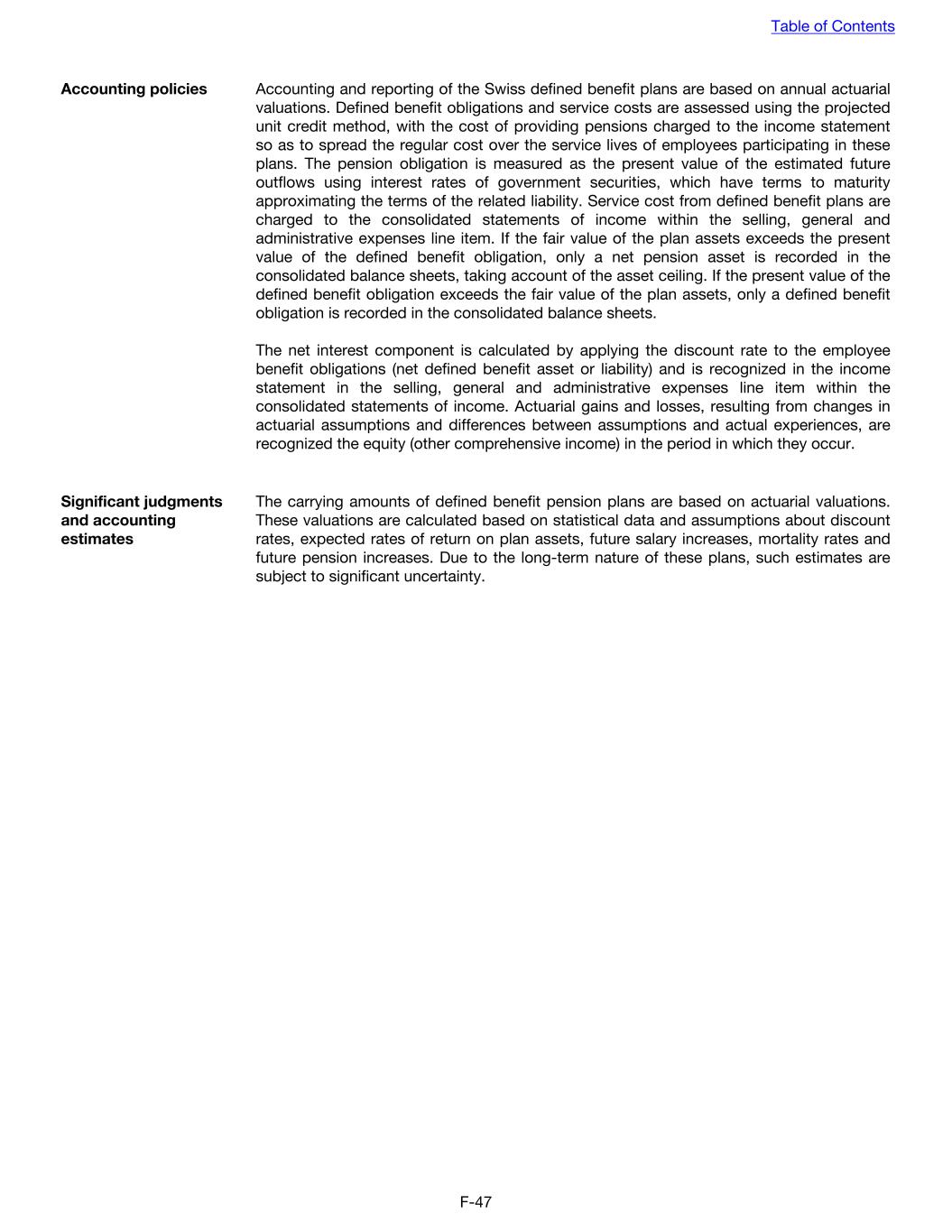 Accounting policies Accounting and reporting of the Swiss defined benefit plans are based on annual actuarial valuations. Defined benefit obligations and service costs are assessed using the projected unit credit method, with the cost of providing pensions charged to the income statement so as to spread the regular cost over the service lives of employees participating in these plans. The pension obligation is measured as the present value of the estimated future outflows using interest rates of government securities, which have terms to maturity approximating the terms of the related liability. Service cost from defined benefit plans are charged to the consolidated statements of income within the selling, general and administrative expenses line item. If the fair value of the plan assets exceeds the present value of the defined benefit obligation, only a net pension asset is recorded in the consolidated balance sheets, taking account of the asset ceiling. If the present value of the defined benefit obligation exceeds the fair value of the plan assets, only a defined benefit obligation is recorded in the consolidated balance sheets. The net interest component is calculated by applying the discount rate to the employee benefit obligations (net defined benefit asset or liability) and is recognized in the income statement in the selling, general and administrative expenses line item within the consolidated statements of income. Actuarial gains and losses, resulting from changes in actuarial assumptions and differences between assumptions and actual experiences, are recognized the equity (other comprehensive income) in the period in which they occur. Significant judgments and accounting estimates The carrying amounts of defined benefit pension plans are based on actuarial valuations. These valuations are calculated based on statistical data and assumptions about discount rates, expected rates of return on plan assets, future salary increases, mortality rates and future pension increases. Due to the long-term nature of these plans, such estimates are subject to significant uncertainty. Table of Contents F-47
