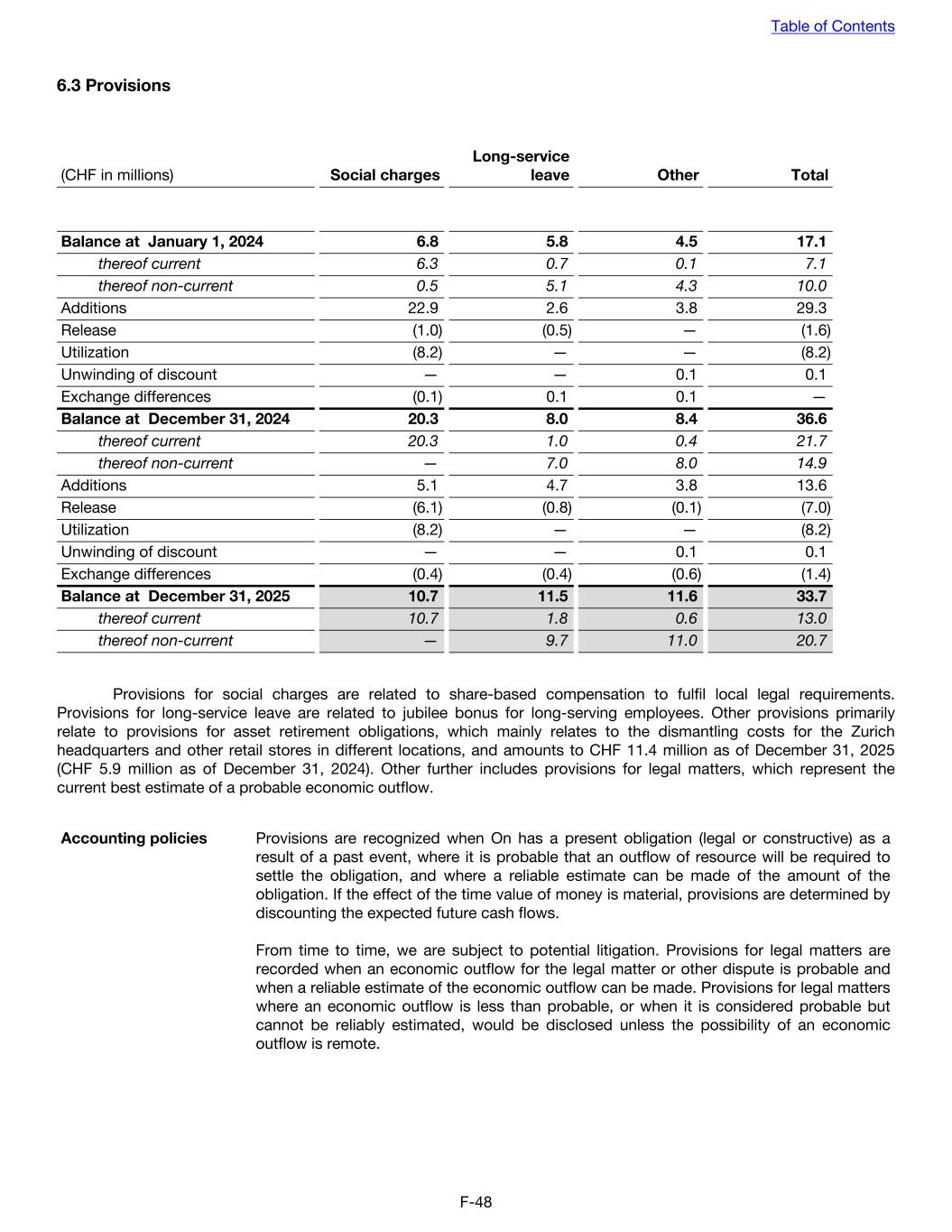 6.3 Provisions (CHF in millions) Social charges Long-service leave Other Total Balance at January 1, 2024 6.8 5.8 4.5 17.1 thereof current 6.3 0.7 0.1 7.1 thereof non-current 0.5 5.1 4.3 10.0 Additions 22.9 2.6 3.8 29.3 Release (1.0) (0.5) — (1.6) Utilization (8.2) — — (8.2) Unwinding of discount — — 0.1 0.1 Exchange differences (0.1) 0.1 0.1 — Balance at December 31, 2024 20.3 8.0 8.4 36.6 thereof current 20.3 1.0 0.4 21.7 thereof non-current — 7.0 8.0 14.9 Additions 5.1 4.7 3.8 13.6 Release (6.1) (0.8) (0.1) (7.0) Utilization (8.2) — — (8.2) Unwinding of discount — — 0.1 0.1 Exchange differences (0.4) (0.4) (0.6) (1.4) Balance at December 31, 2025 10.7 11.5 11.6 33.7 thereof current 10.7 1.8 0.6 13.0 thereof non-current — 9.7 11.0 20.7 Provisions for social charges are related to share-based compensation to fulfil local legal requirements. Provisions for long-service leave are related to jubilee bonus for long-serving employees. Other provisions primarily relate to provisions for asset retirement obligations, which mainly relates to the dismantling costs for the Zurich headquarters and other retail stores in different locations, and amounts to CHF 11.4 million as of December 31, 2025 (CHF 5.9 million as of December 31, 2024). Other further includes provisions for legal matters, which represent the current best estimate of a probable economic outflow. Accounting policies Provisions are recognized when On has a present obligation (legal or constructive) as a result of a past event, where it is probable that an outflow of resource will be required to settle the obligation, and where a reliable estimate can be made of the amount of the obligation. If the effect of the time value of money is material, provisions are determined by discounting the expected future cash flows. From time to time, we are subject to potential litigation. Provisions for legal matters are recorded when an economic outflow for the legal matter or other dispute is probable and when a reliable estimate of the economic outflow can be made. Provisions for legal matters where an economic outflow is less than probable, or when it is considered probable but cannot be reliably estimated, would be disclosed unless the possibility of an economic outflow is remote. Table of Contents F-48