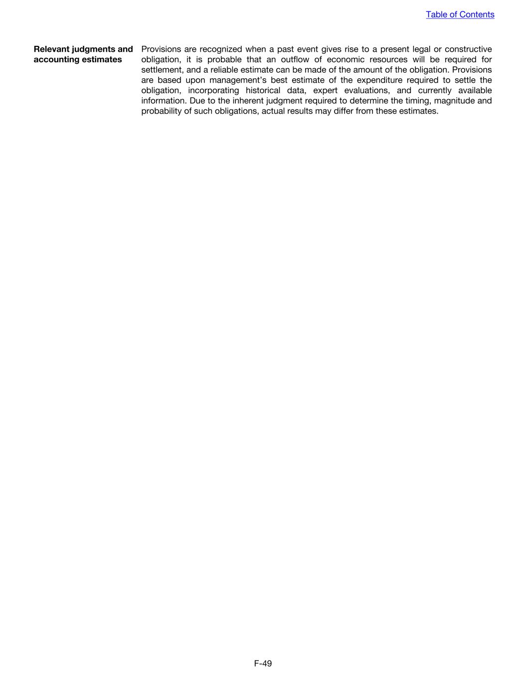 Relevant judgments and accounting estimates Provisions are recognized when a past event gives rise to a present legal or constructive obligation, it is probable that an outflow of economic resources will be required for settlement, and a reliable estimate can be made of the amount of the obligation. Provisions are based upon management’s best estimate of the expenditure required to settle the obligation, incorporating historical data, expert evaluations, and currently available information. Due to the inherent judgment required to determine the timing, magnitude and probability of such obligations, actual results may differ from these estimates. Table of Contents F-49