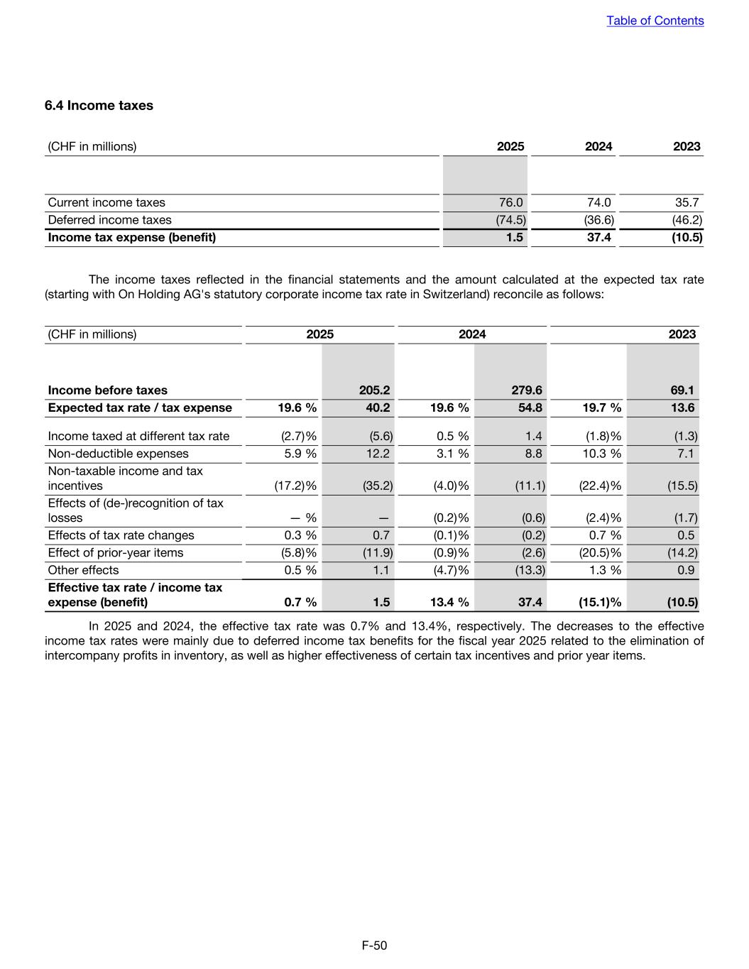 6.4 Income taxes (CHF in millions) 2025 2024 2023 Current income taxes 76.0 74.0 35.7 Deferred income taxes (74.5) (36.6) (46.2) Income tax expense (benefit) 1.5 37.4 (10.5) The income taxes reflected in the financial statements and the amount calculated at the expected tax rate (starting with On Holding AG's statutory corporate income tax rate in Switzerland) reconcile as follows: (CHF in millions) 2025 2024 2023 Income before taxes 205.2 279.6 69.1 Expected tax rate / tax expense 19.6 % 40.2 19.6 % 54.8 19.7 % 13.6 Income taxed at different tax rate (2.7) % (5.6) 0.5 % 1.4 (1.8) % (1.3) Non-deductible expenses 5.9 % 12.2 3.1 % 8.8 10.3 % 7.1 Non-taxable income and tax incentives (17.2) % (35.2) (4.0) % (11.1) (22.4) % (15.5) Effects of (de-)recognition of tax losses — % — (0.2) % (0.6) (2.4) % (1.7) Effects of tax rate changes 0.3 % 0.7 (0.1) % (0.2) 0.7 % 0.5 Effect of prior-year items (5.8) % (11.9) (0.9) % (2.6) (20.5) % (14.2) Other effects 0.5 % 1.1 (4.7) % (13.3) 1.3 % 0.9 Effective tax rate / income tax expense (benefit) 0.7 % 1.5 13.4 % 37.4 (15.1) % (10.5) In 2025 and 2024, the effective tax rate was 0.7% and 13.4%, respectively. The decreases to the effective income tax rates were mainly due to deferred income tax benefits for the fiscal year 2025 related to the elimination of intercompany profits in inventory, as well as higher effectiveness of certain tax incentives and prior year items. Table of Contents F-50