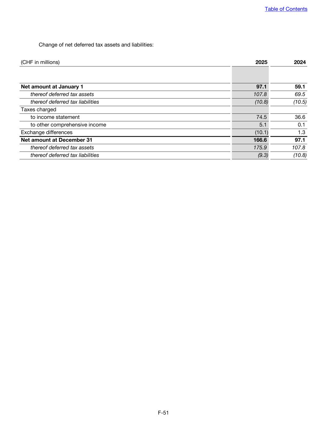Change of net deferred tax assets and liabilities: (CHF in millions) 2025 2024 Net amount at January 1 97.1 59.1 thereof deferred tax assets 107.8 69.5 thereof deferred tax liabilities (10.8) (10.5) Taxes charged to income statement 74.5 36.6 to other comprehensive income 5.1 0.1 Exchange differences (10.1) 1.3 Net amount at December 31 166.6 97.1 thereof deferred tax assets 175.9 107.8 thereof deferred tax liabilities (9.3) (10.8) Table of Contents F-51