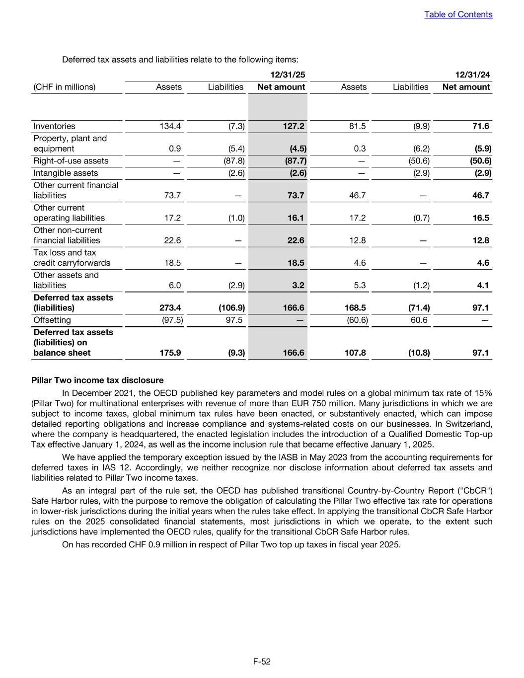 Deferred tax assets and liabilities relate to the following items: 12/31/25 12/31/24 (CHF in millions) Assets Liabilities Net amount Assets Liabilities Net amount Inventories 134.4 (7.3) 127.2 81.5 (9.9) 71.6 Property, plant and equipment 0.9 (5.4) (4.5) 0.3 (6.2) (5.9) Right-of-use assets — (87.8) (87.7) — (50.6) (50.6) Intangible assets — (2.6) (2.6) — (2.9) (2.9) Other current financial liabilities 73.7 — 73.7 46.7 — 46.7 Other current operating liabilities 17.2 (1.0) 16.1 17.2 (0.7) 16.5 Other non-current financial liabilities 22.6 — 22.6 12.8 — 12.8 Tax loss and tax credit carryforwards 18.5 — 18.5 4.6 — 4.6 Other assets and liabilities 6.0 (2.9) 3.2 5.3 (1.2) 4.1 Deferred tax assets (liabilities) 273.4 (106.9) 166.6 168.5 (71.4) 97.1 Offsetting (97.5) 97.5 — (60.6) 60.6 — Deferred tax assets (liabilities) on balance sheet 175.9 (9.3) 166.6 107.8 (10.8) 97.1 Pillar Two income tax disclosure In December 2021, the OECD published key parameters and model rules on a global minimum tax rate of 15% (Pillar Two) for multinational enterprises with revenue of more than EUR 750 million. Many jurisdictions in which we are subject to income taxes, global minimum tax rules have been enacted, or substantively enacted, which can impose detailed reporting obligations and increase compliance and systems-related costs on our businesses. In Switzerland, where the company is headquartered, the enacted legislation includes the introduction of a Qualified Domestic Top-up Tax effective January 1, 2024, as well as the income inclusion rule that became effective January 1, 2025. We have applied the temporary exception issued by the IASB in May 2023 from the accounting requirements for deferred taxes in IAS 12. Accordingly, we neither recognize nor disclose information about deferred tax assets and liabilities related to Pillar Two income taxes. As an integral part of the rule set, the OECD has published transitional Country-by-Country Report ("CbCR") Safe Harbor rules, with the purpose to remove the obligation of calculating the Pillar Two effective tax rate for operations in lower-risk jurisdictions during the initial years when the rules take effect. In applying the transitional CbCR Safe Harbor rules on the 2025 consolidated financial statements, most jurisdictions in which we operate, to the extent such jurisdictions have implemented the OECD rules, qualify for the transitional CbCR Safe Harbor rules. On has recorded CHF 0.9 million in respect of Pillar Two top up taxes in fiscal year 2025. Table of Contents F-52