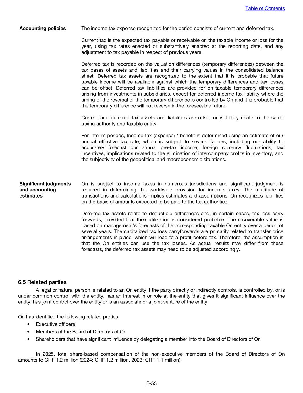 Accounting policies The income tax expense recognized for the period consists of current and deferred tax. Current tax is the expected tax payable or receivable on the taxable income or loss for the year, using tax rates enacted or substantively enacted at the reporting date, and any adjustment to tax payable in respect of previous years. Deferred tax is recorded on the valuation differences (temporary differences) between the tax bases of assets and liabilities and their carrying values in the consolidated balance sheet. Deferred tax assets are recognized to the extent that it is probable that future taxable income will be available against which the temporary differences and tax losses can be offset. Deferred tax liabilities are provided for on taxable temporary differences arising from investments in subsidiaries, except for deferred income tax liability where the timing of the reversal of the temporary difference is controlled by On and it is probable that the temporary difference will not reverse in the foreseeable future. Current and deferred tax assets and liabilities are offset only if they relate to the same taxing authority and taxable entity. For interim periods, Income tax (expense) / benefit is determined using an estimate of our annual effective tax rate, which is subject to several factors, including our ability to accurately forecast our annual pre-tax income, foreign currency fluctuations, tax incentives, implications related to the elimination of intercompany profits in inventory, and the subjectivity of the geopolitical and macroeconomic situations. Significant judgments and accounting estimates On is subject to income taxes in numerous jurisdictions and significant judgment is required in determining the worldwide provision for income taxes. The multitude of transactions and calculations implies estimates and assumptions. On recognizes liabilities on the basis of amounts expected to be paid to the tax authorities. Deferred tax assets relate to deductible differences and, in certain cases, tax loss carry forwards, provided that their utilization is considered probable. The recoverable value is based on management's forecasts of the corresponding taxable On entity over a period of several years. The capitalized tax loss carryforwards are primarily related to transfer price arrangements in place, which will lead to a profit before tax. Therefore, the assumption is that the On entities can use the tax losses. As actual results may differ from these forecasts, the deferred tax assets may need to be adjusted accordingly. 6.5 Related parties A legal or natural person is related to an On entity if the party directly or indirectly controls, is controlled by, or is under common control with the entity, has an interest in or role at the entity that gives it significant influence over the entity, has joint control over the entity or is an associate or a joint venture of the entity. On has identified the following related parties: • Executive officers • Members of the Board of Directors of On • Shareholders that have significant influence by delegating a member into the Board of Directors of On In 2025, total share-based compensation of the non-executive members of the Board of Directors of On amounts to CHF 1.2 million (2024: CHF 1.2 million, 2023: CHF 1.1 million). Table of Contents F-53