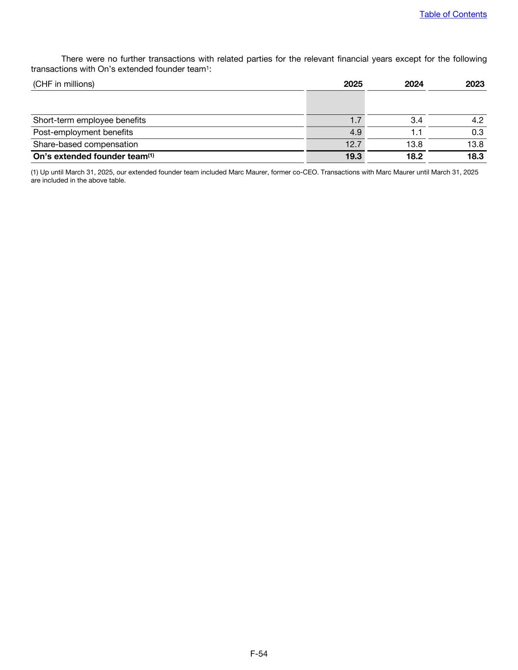 There were no further transactions with related parties for the relevant financial years except for the following transactions with On’s extended founder team1: (CHF in millions) 2025 2024 2023 Short-term employee benefits 1.7 3.4 4.2 Post-employment benefits 4.9 1.1 0.3 Share-based compensation 12.7 13.8 13.8 On’s extended founder team(1) 19.3 18.2 18.3 (1) Up until March 31, 2025, our extended founder team included Marc Maurer, former co-CEO. Transactions with Marc Maurer until March 31, 2025 are included in the above table. Table of Contents F-54